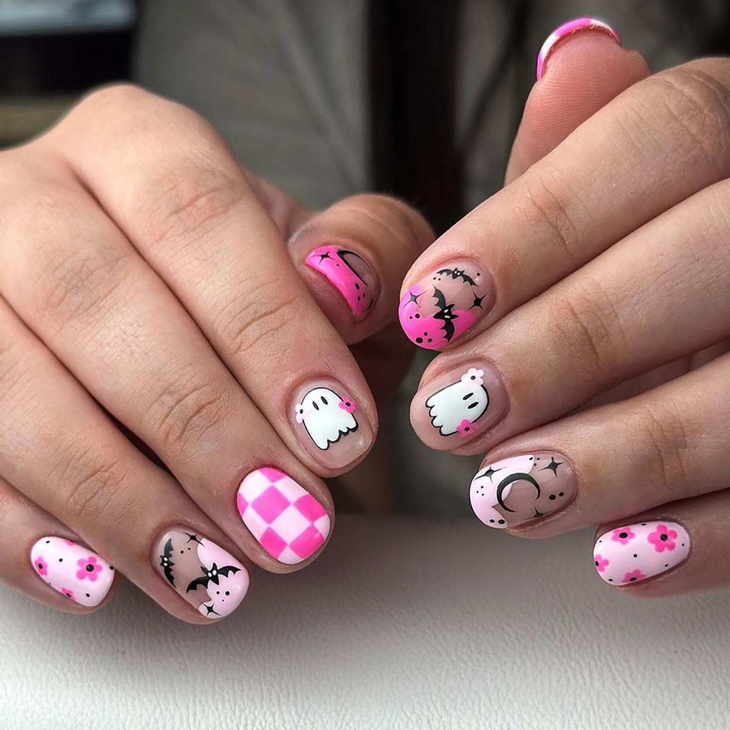 Short Halloween Press on Nails Pink Square Fake Nails Full Cover Glossy Acrylic Nails Ghost Bat Flower Design Cute Glue on Nails S