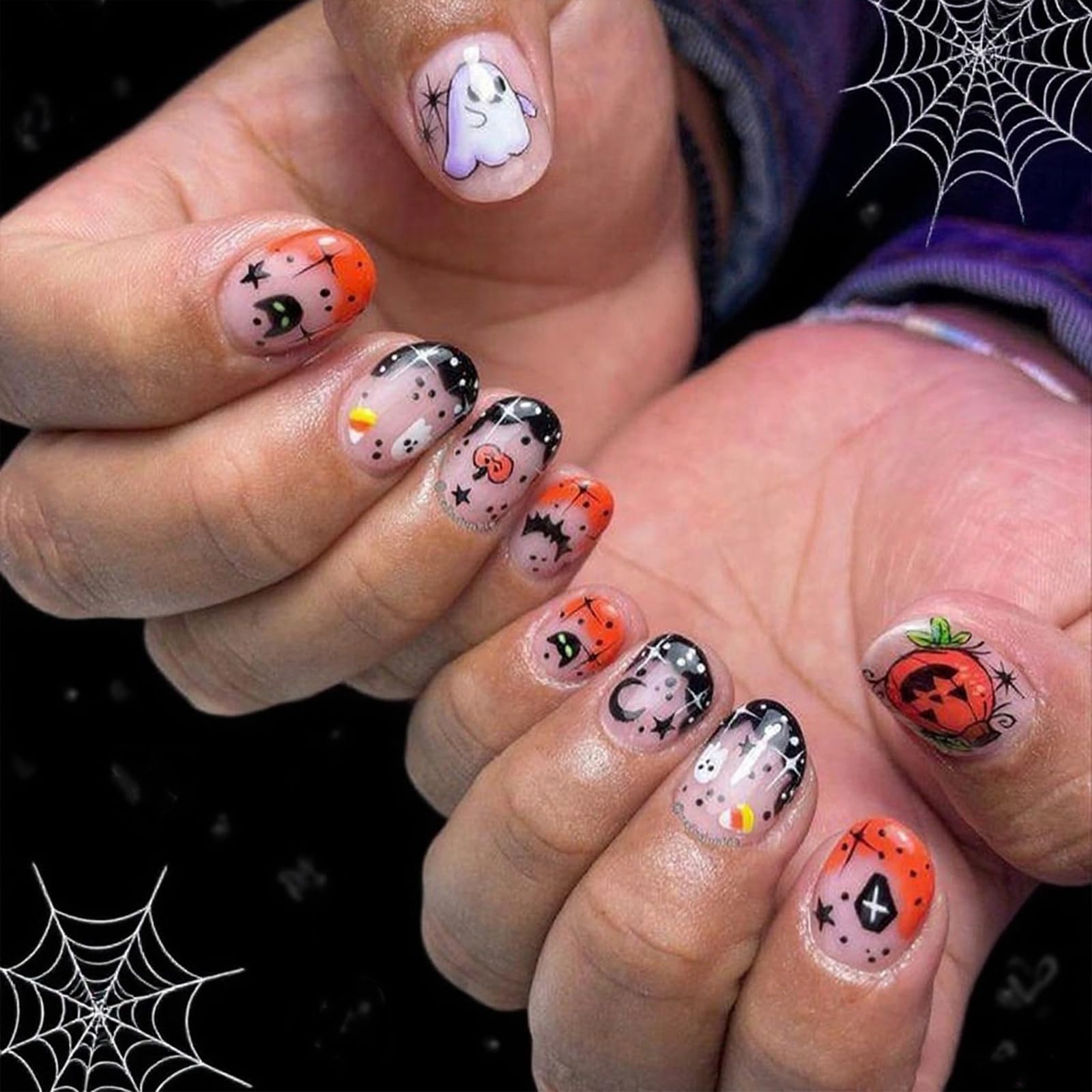 24Pcs French Tip Press on Nails Short Almond Fake Nails with halloween Designs Spider Web Pumpkin Glue on Nails halloween False Na