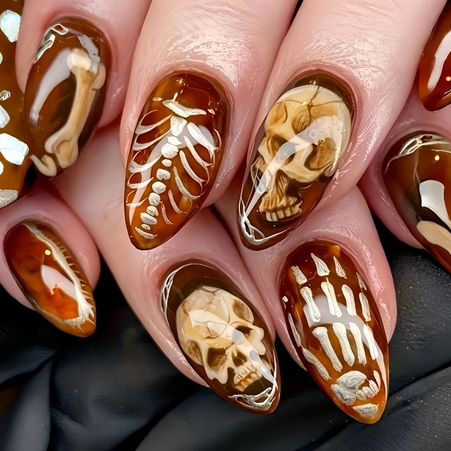 24Pcs Halloween Press on Nails Skeleton Ghost Fake Nails Medium Almond Glue on Nails Glossy Full Cover Artificial Nail Halloween S