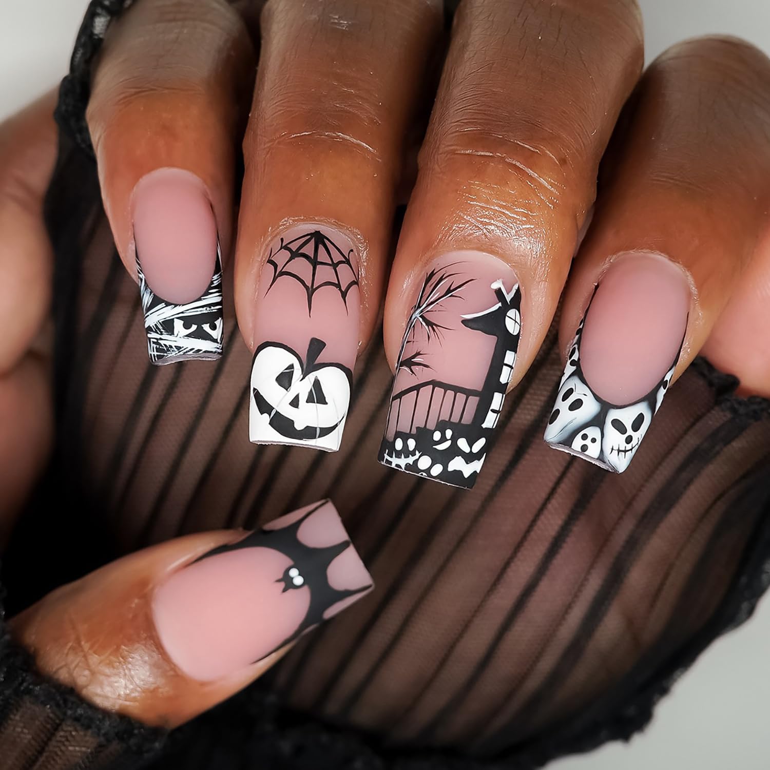 Halloween Press on Nails Short French Tip Fake Nails Spider Web Pumpkin Bat False Nails Nude Acrylic Nails Square Shape Acrylic Na