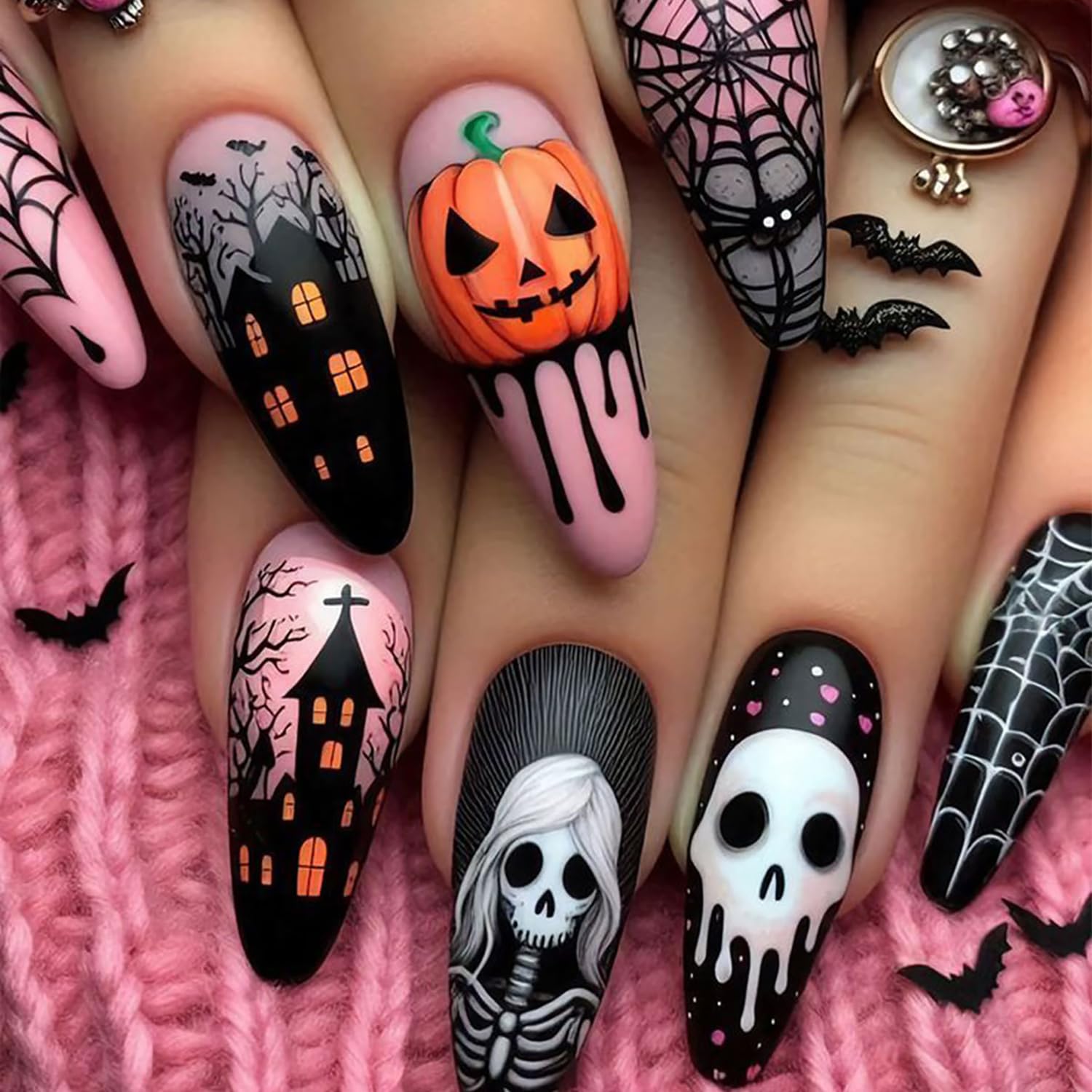 24Pcs Almond Halloween Press on Nails Spider Web Skeleton Fake Nails Medium Length Stick on Nails Full Cover False Nail Tips Hallo