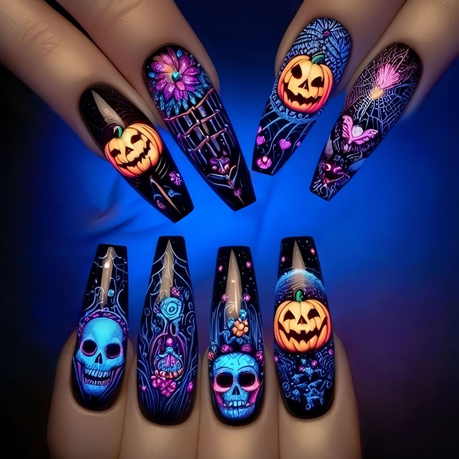 Medium Halloween Press on Nails Coffin Shaped Fake Nails Full Cover Pumpkin Skull False Nails Glossy Press on Acrylic Nails Hallow