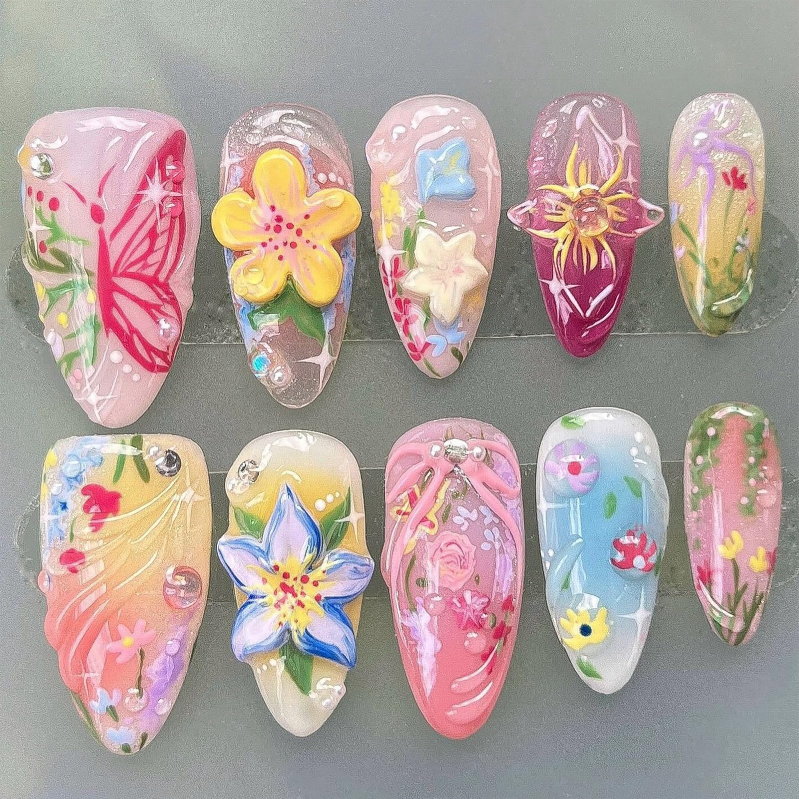 Almond Press on Nails Medium Fake Nails Colorful Flower Acrylic Nails Silver Butterfly Stick on Nails Reusable Leaf False Nails wi