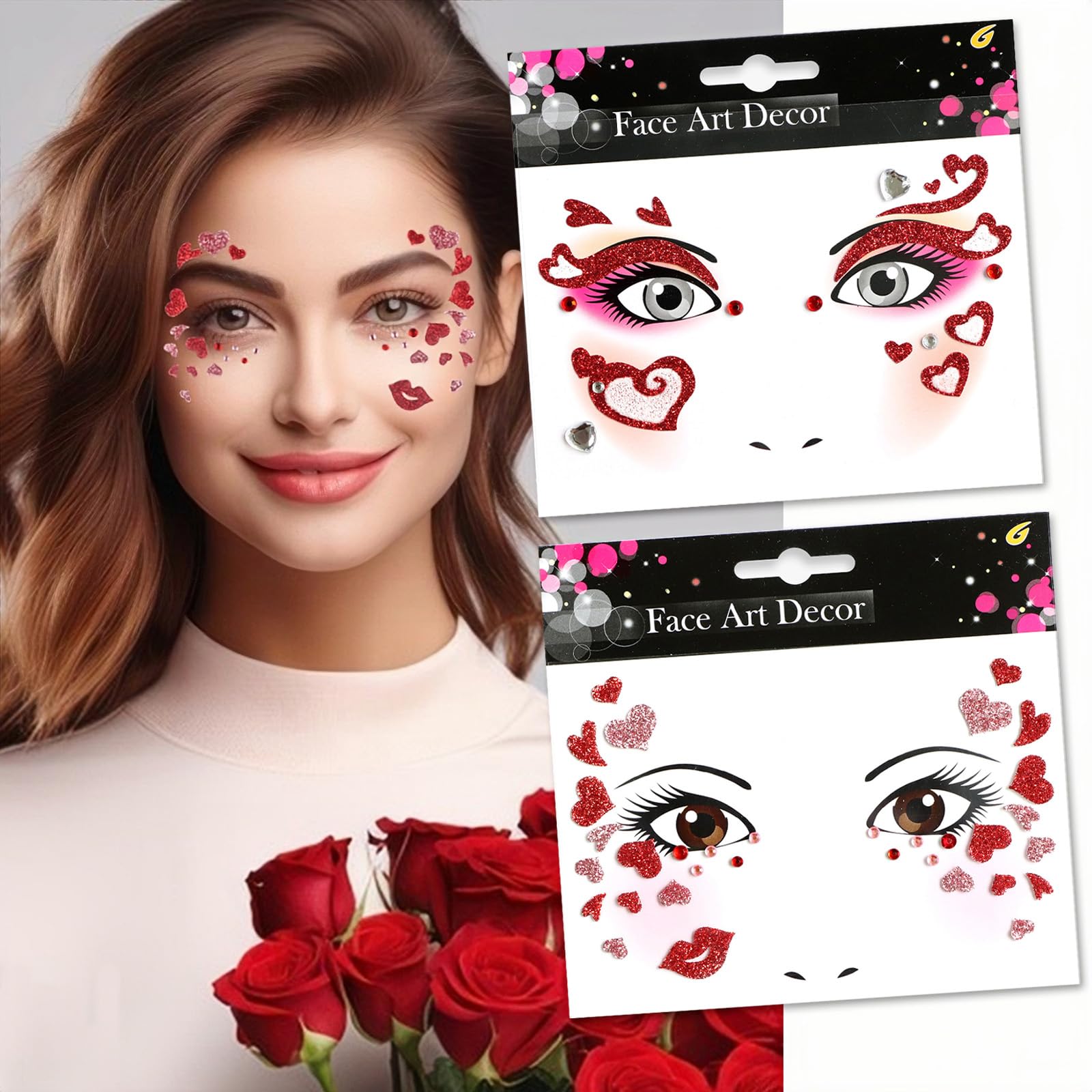 Tatuajes temporales de San Valentín, tatuajes falsos con purpurina y corazón rojo, calcomanías de tatuaje de labios, ojos, rostro,