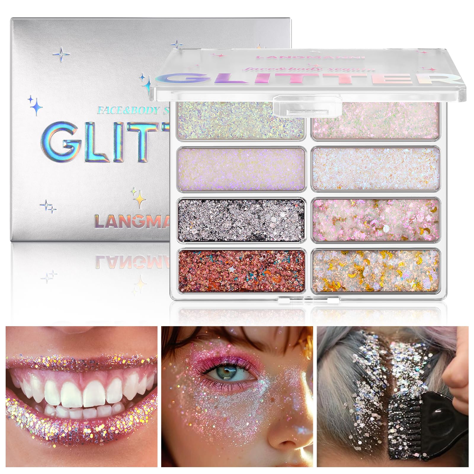 LANGMANNI Paleta de purpurina de 8 colores para rostro y cuerpo, lentejuelas holográficas cambiantes de sirena para mujeres y niña