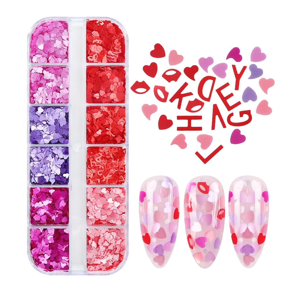 12 rejillas de colores mixtos para decoración de uñas de San Valentín, lentejuelas con purpurina, estrellas de amor, letras, labio