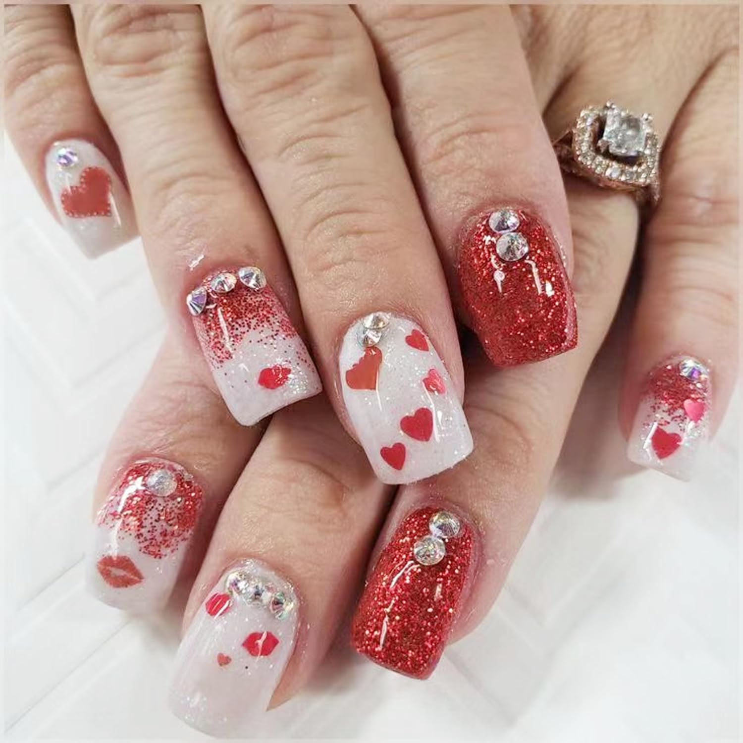 24 uñas postizas cuadradas cortas con diamantes de imitación de corazón, uñas acrílicas de cobertura completa, con labios rojos co