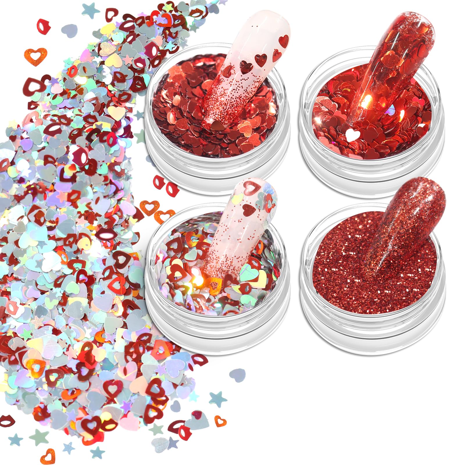 Allstarry Lentejuelas para arte de uñas con purpurina de corazón, 4 colores, confeti holográfico en forma de corazón 3D, estrella