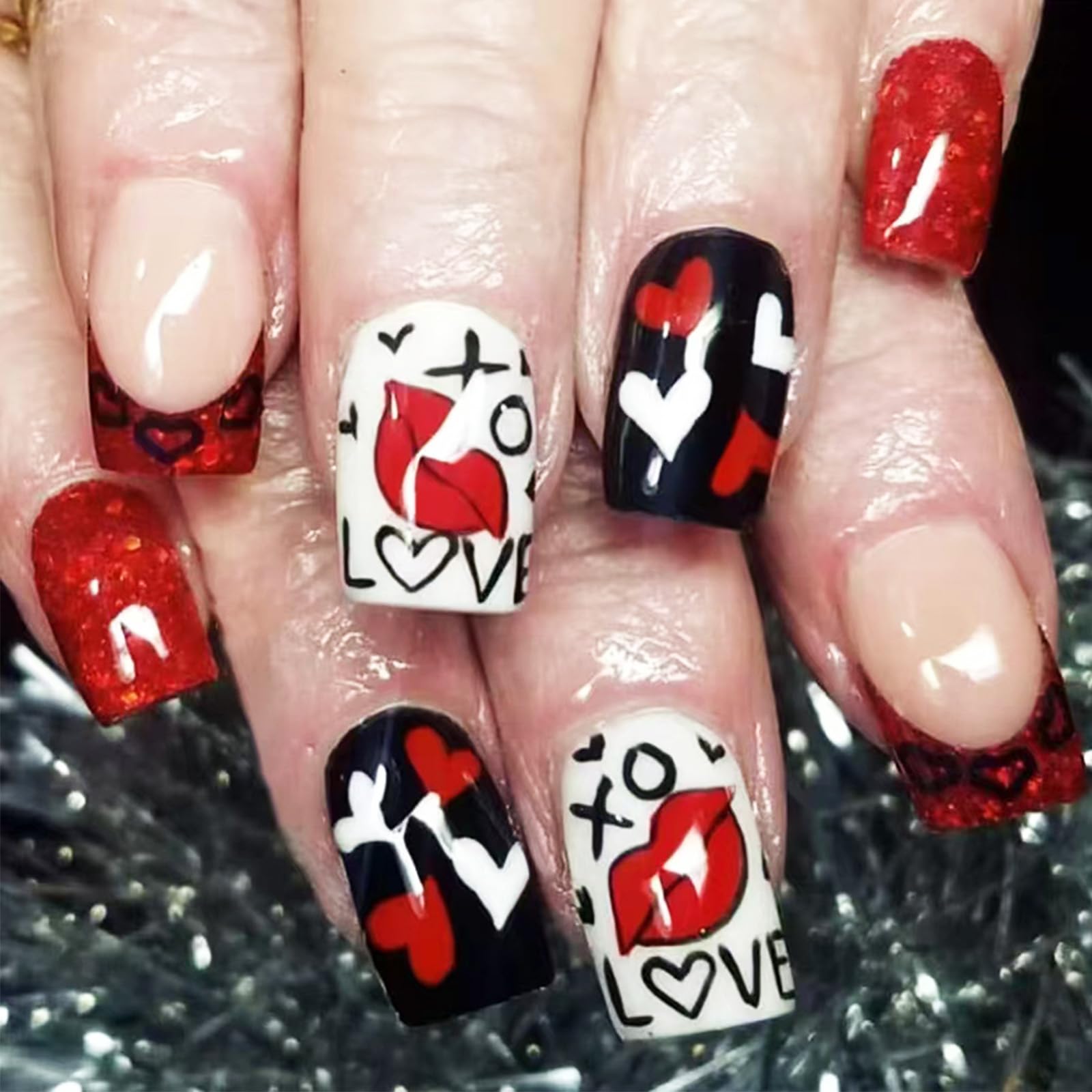 24 uñas postizas a presión con labios rojos sexis para San Valentín, uñas postizas con purpurina roja brillante, puntas francesas