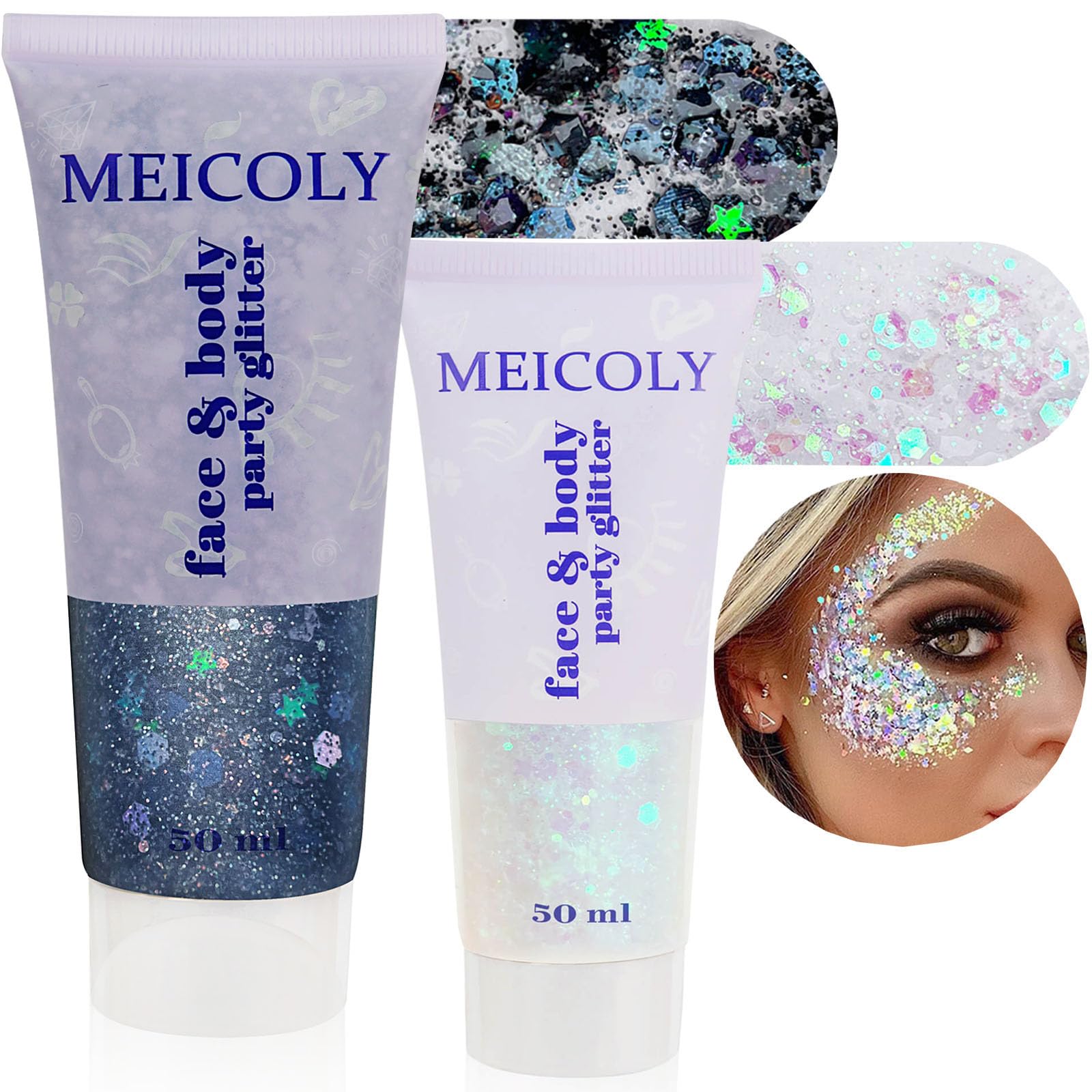 MEICOLY Juego de purpurina negra y blanca transparente, gel de purpurina de cara de sirena, accesorios para festivales de cantante
