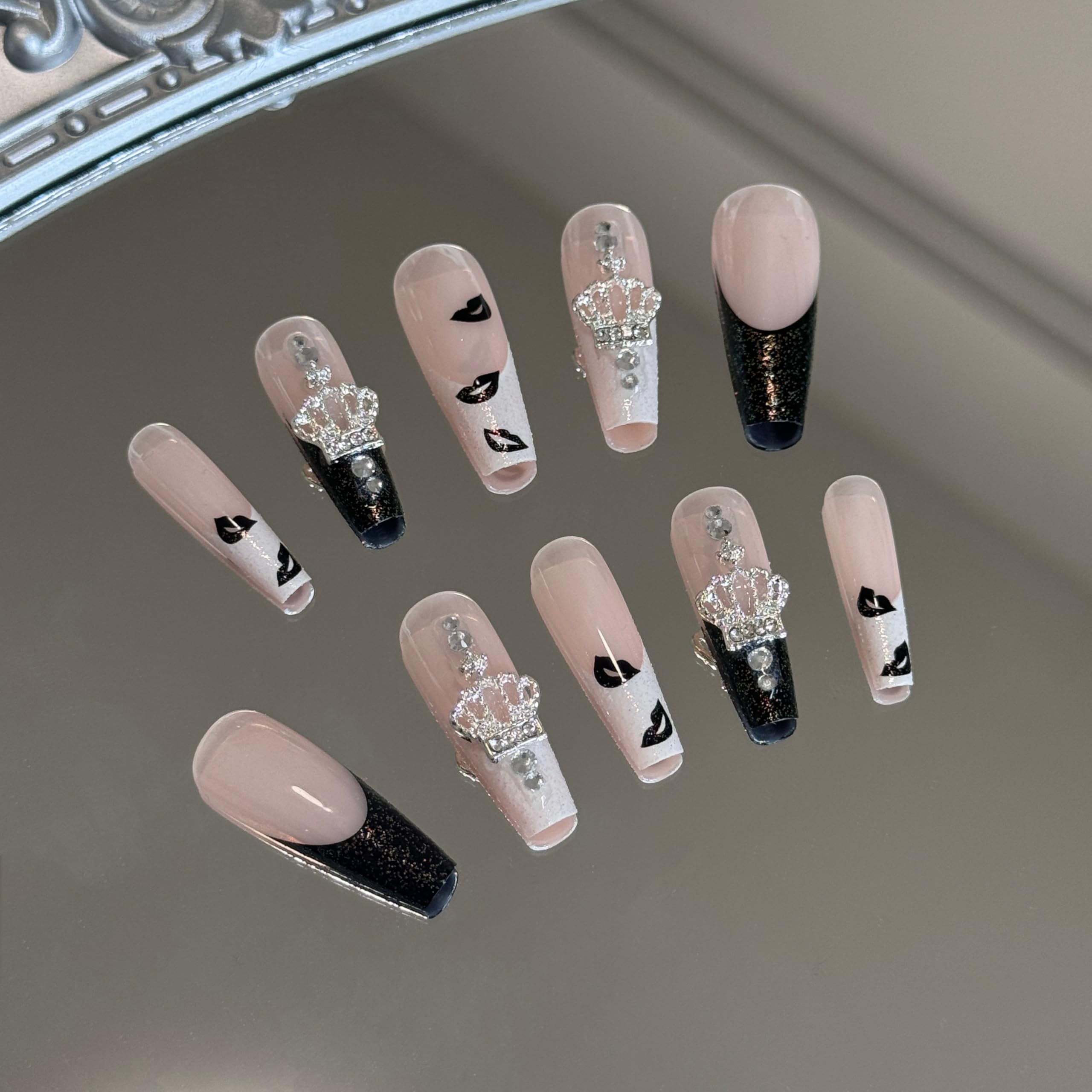 24 uñas a presión – Uñas cuadradas largas con estampado de labios Y2k, acrílico brillante con purpurina y diseño de dijes de aleac