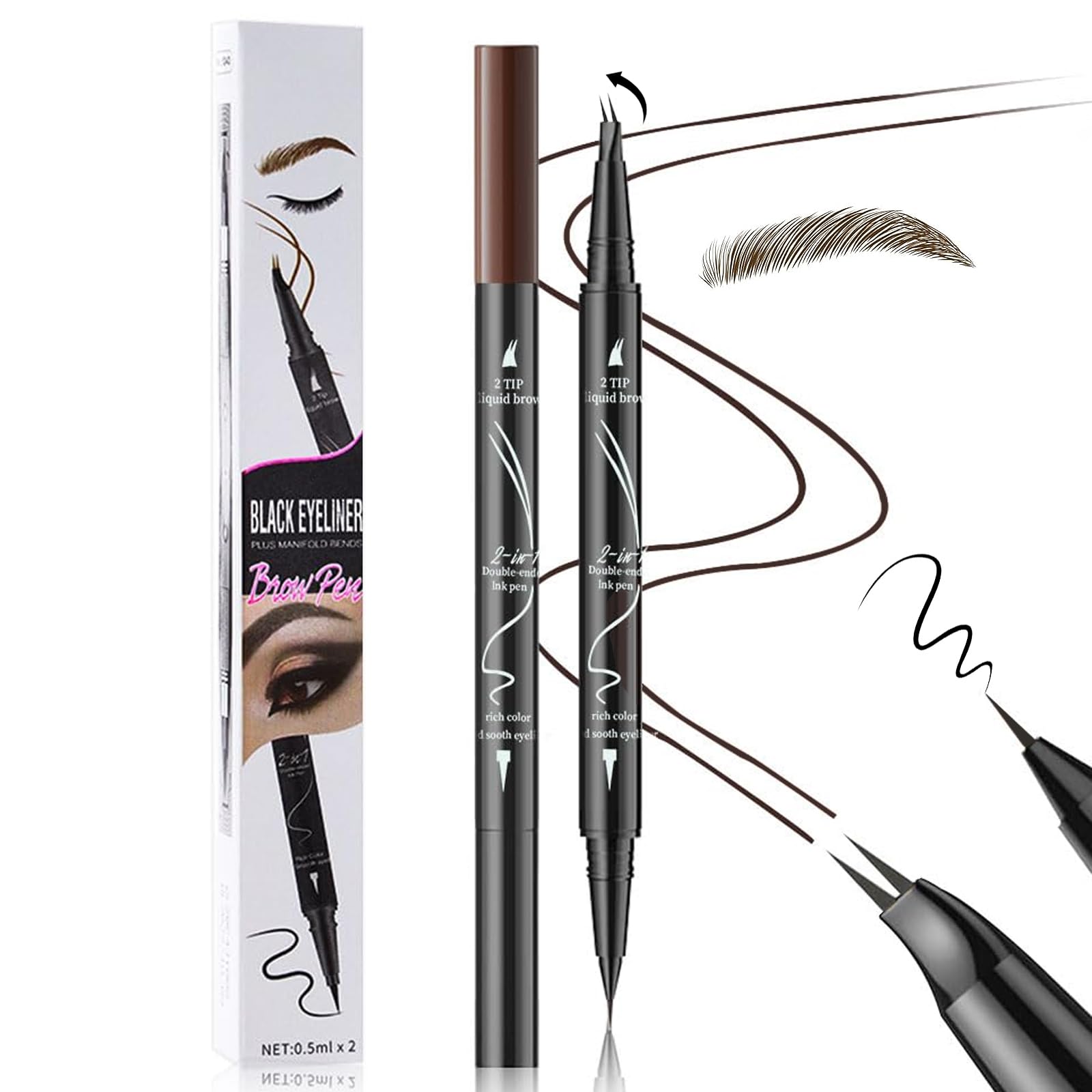 Lápiz de cejas curvado de 2 puntas, color marrón con delineador de ojos negro, 2 en 1, doble extremo, crea cejas naturales similar