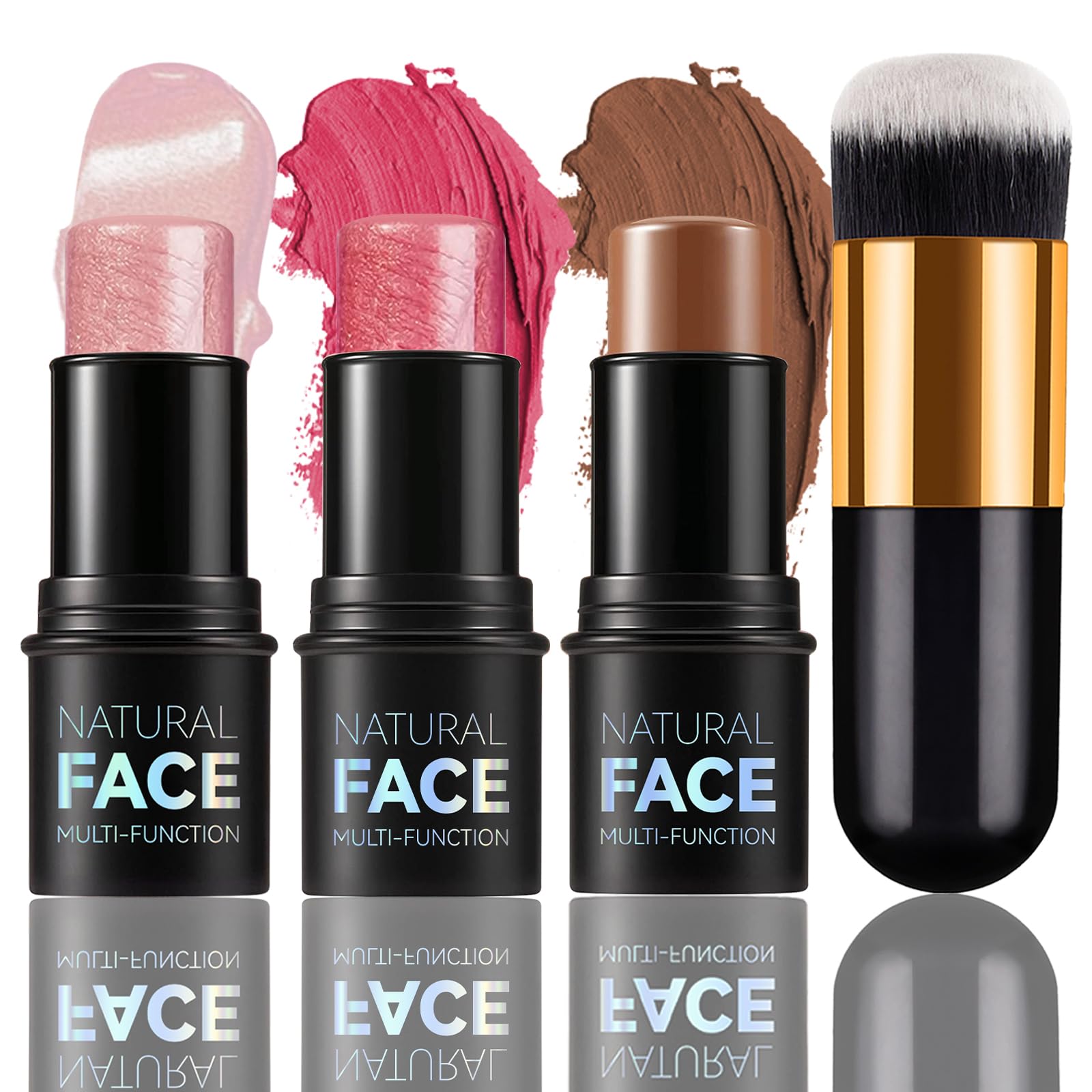 RoseFlower Juego de 3 piezas de barra de contorno facial, resaltador en barra de rubor en crema con pincel, barra de contorno para