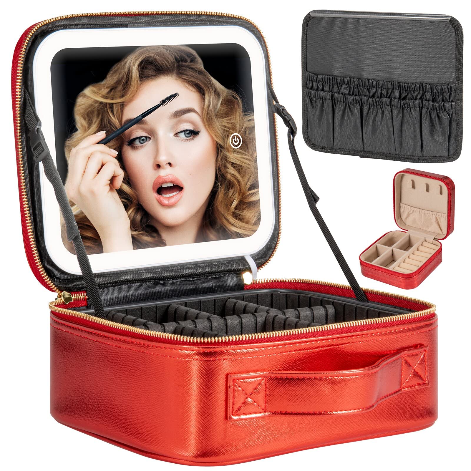Estuche de viaje de maquillaje con espejo con luz LED, 3 brillo ajustable, bolsa de cosméticos, almacenamiento portátil, partición