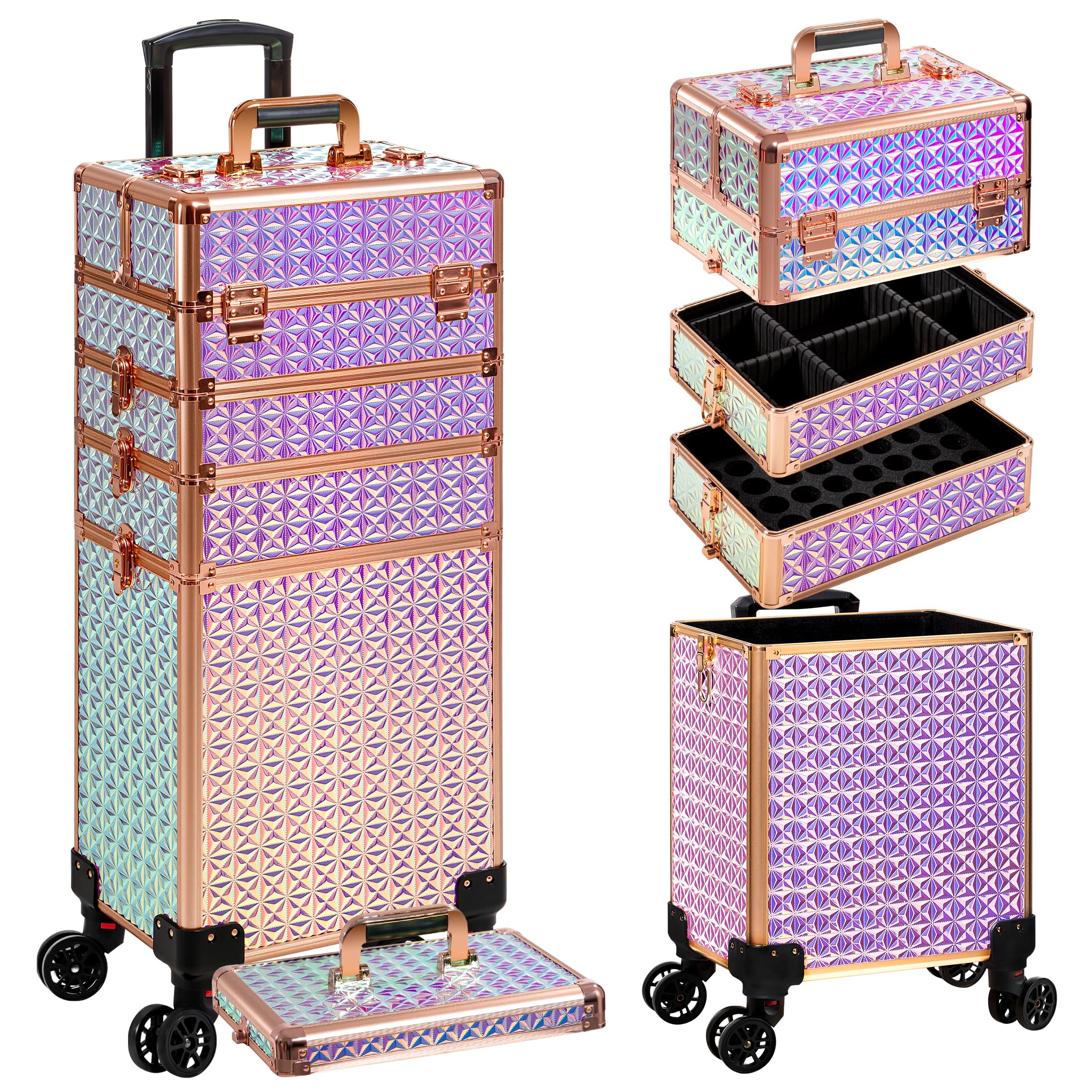 AROUS Estuche de tren de maquillaje rodante 5 en 1, estuche de cosmetología sobre ruedas, organizador de cosméticos grande, carrit
