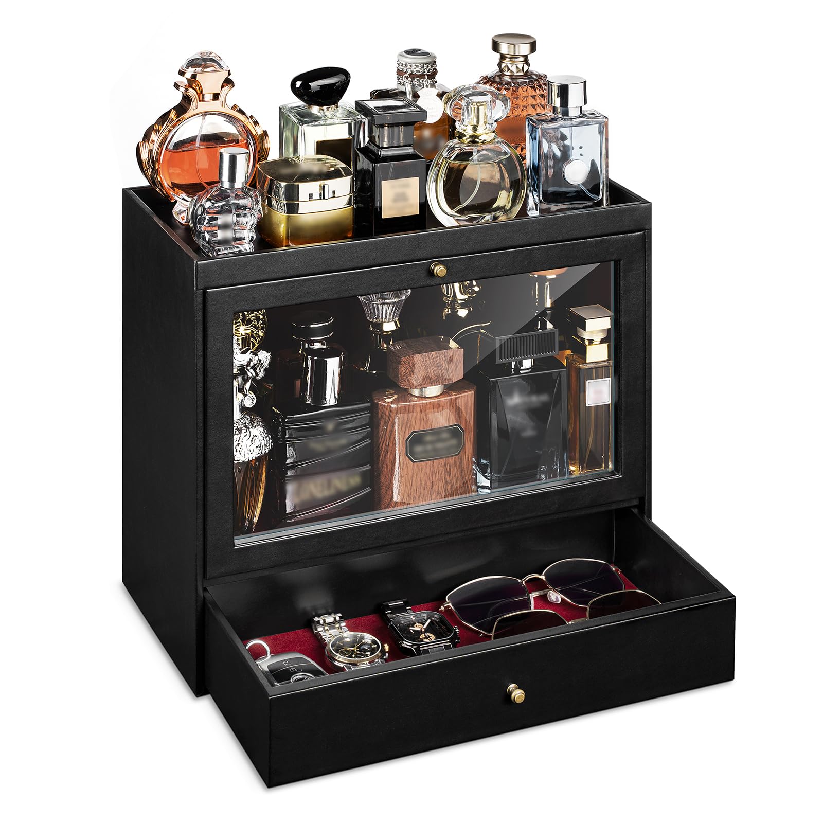Organizador de colonia, organizador de perfumes de cuero para tocador, soporte de colonia a prueba de polvo de gran capacidad con