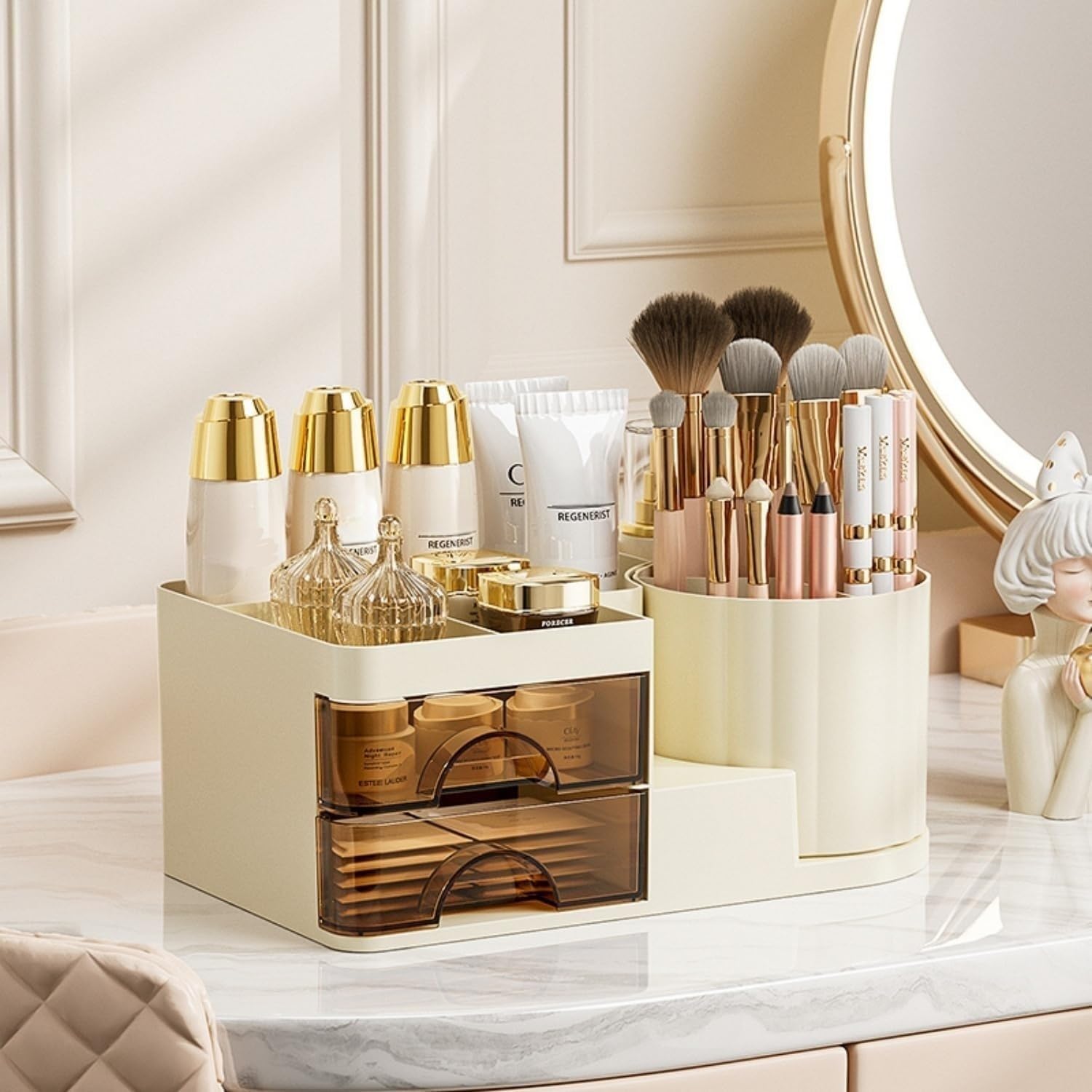 Organizador de maquillaje para tocador con 2 cajones, soporte giratorio para brochas de maquillaje, soporte organizador de baño, v