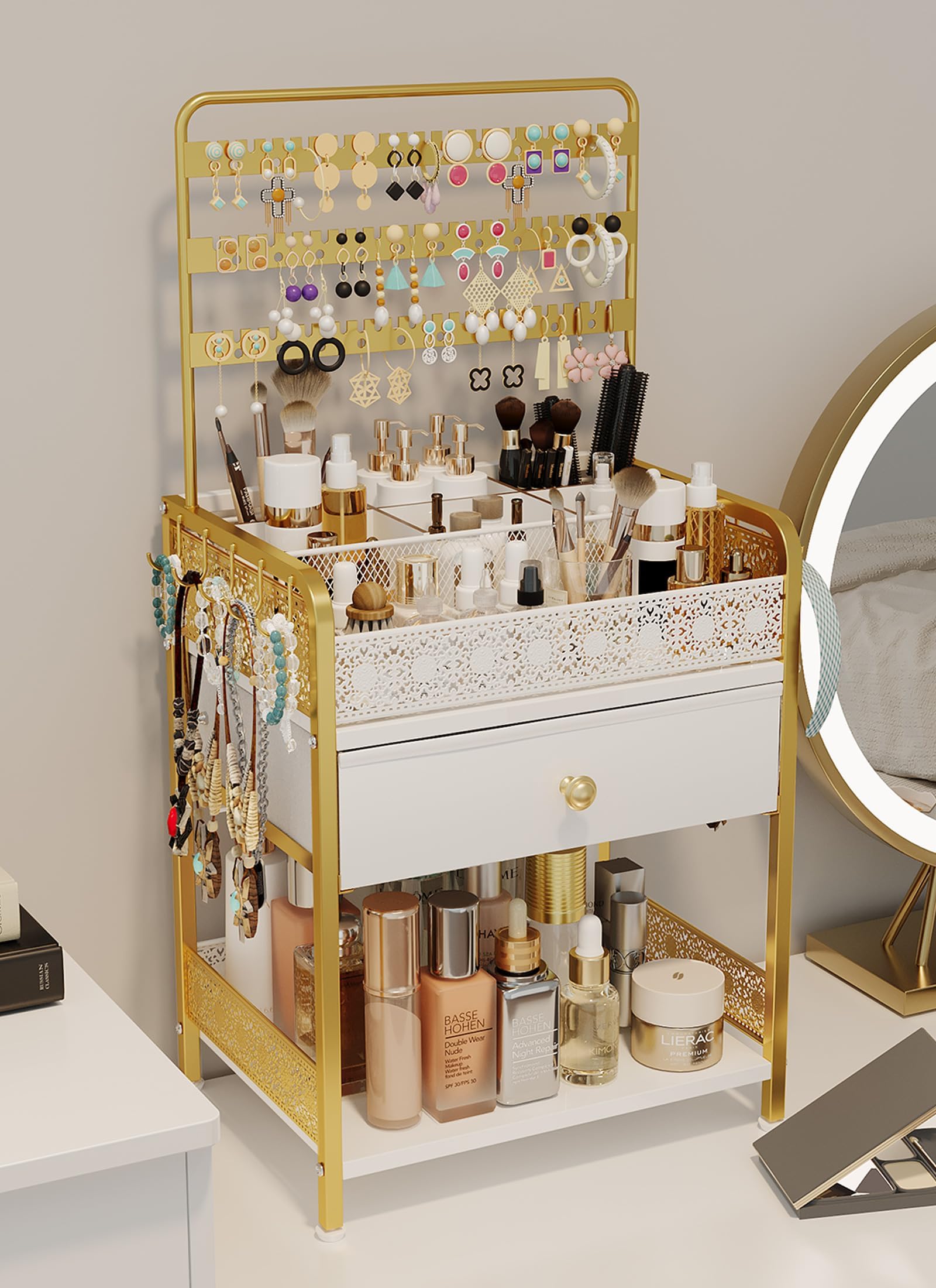 Organizador de maquillaje para encimera con cajón, organizador de tocador de gran capacidad con soporte para joyas, escritorio de