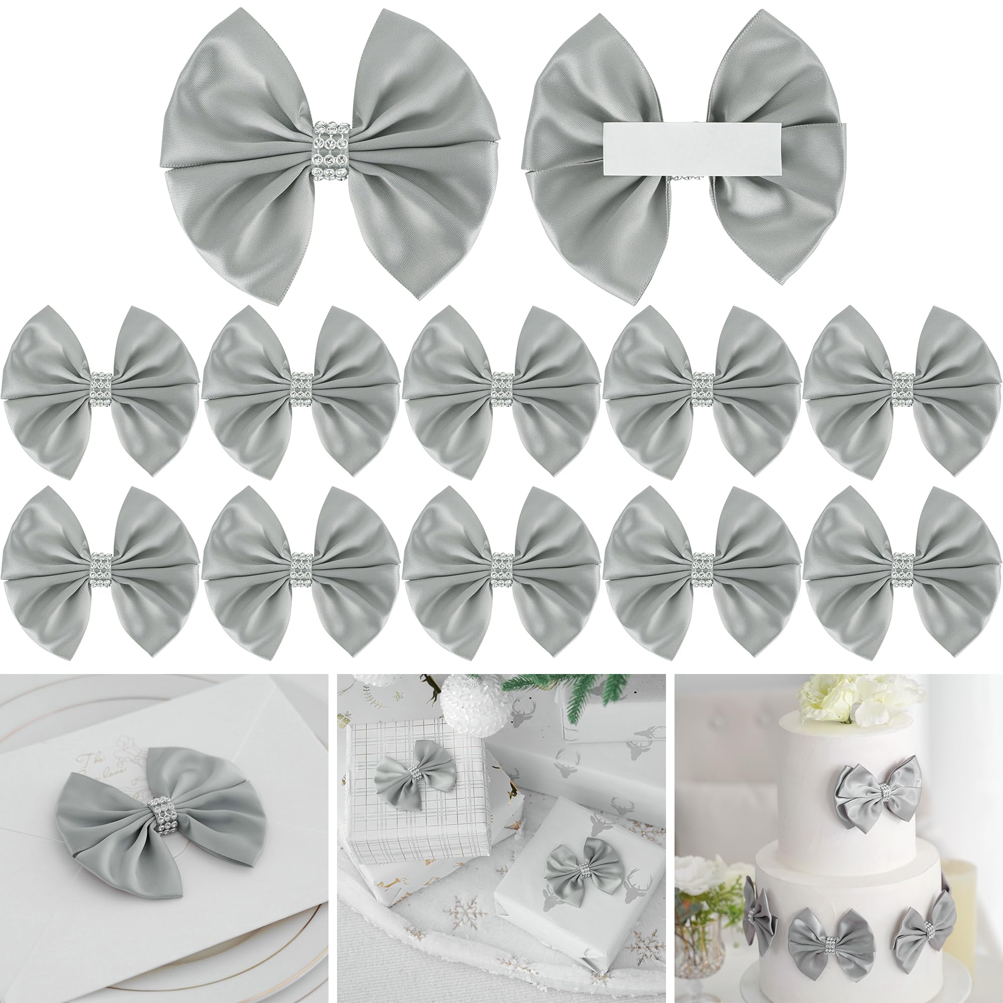 Lazo plateado de 3.5 pulgadas, lazos de cinta de satén con lazos giratorios, lazos autoadhesivos con diamantes de imitación, lazos