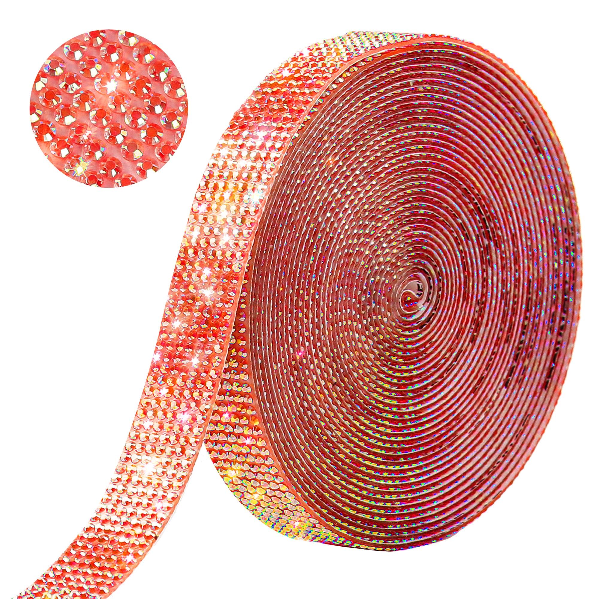 PEARLY JUN Cinta de diamantes de imitación autoadhesiva de 1 yarda, tiras de brillo rojo con purpurina, cadena de lentejuelas para