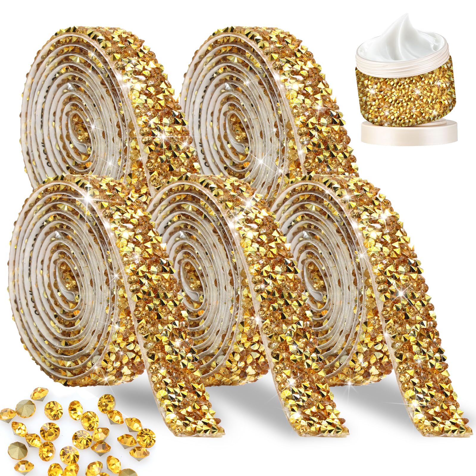 FULZTEY 5 rollos de cintas de diamantes de imitación, tiras de diamantes de imitación doradas para manualidades, cinta adhesiva de