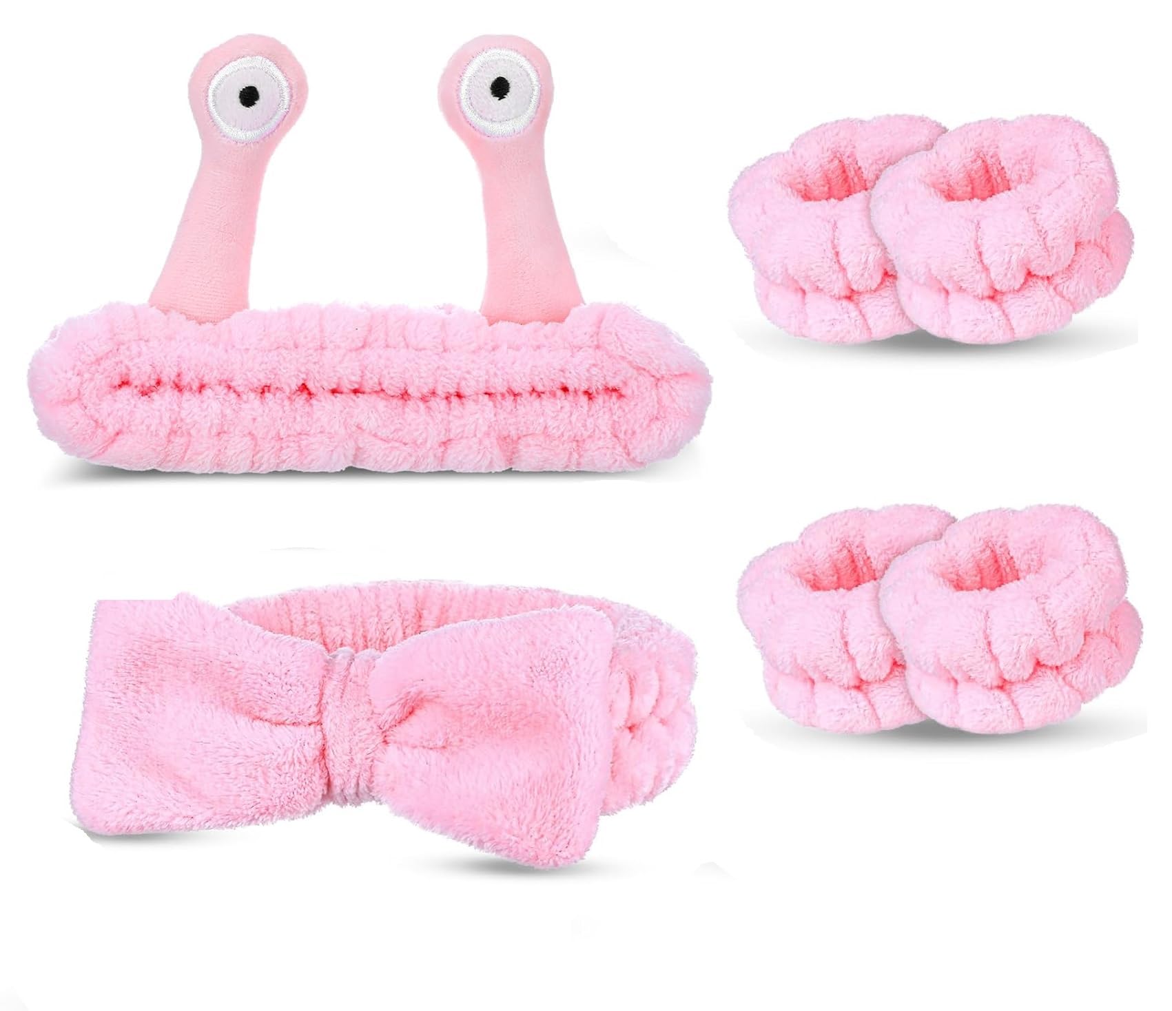 6Pcs Pink Spa Headband and Wristband Set Cute Coral Fleece Snail Spa Skincare Makeup Hair Bands Washing Wristbands Creative Hair A