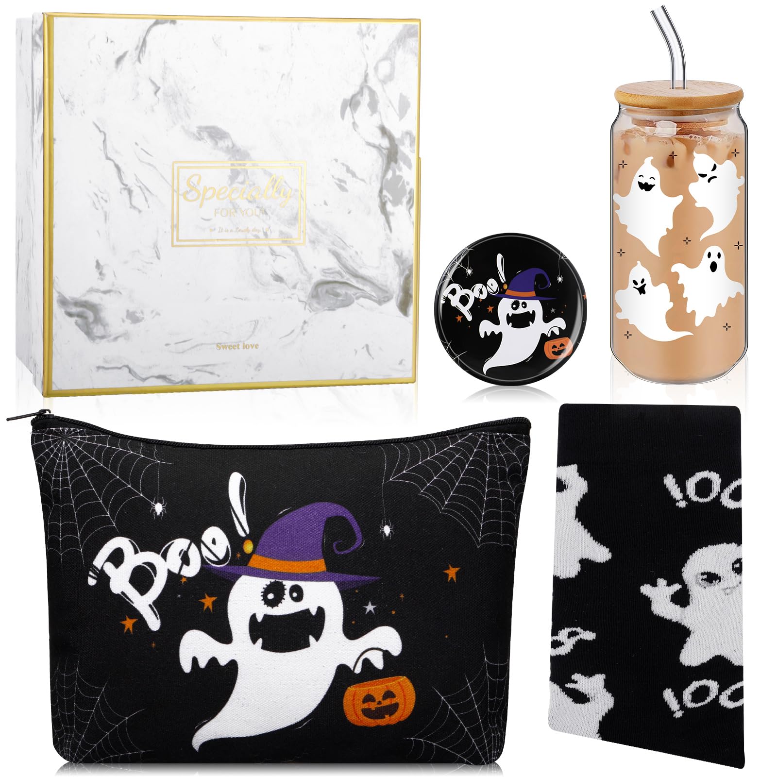 Kacctyen Juego de 5 regalos de fantasmas de Halloween, vaso de 16 onzas con tapa, bolsa de maquillaje, bolsa de viaje para cosméti