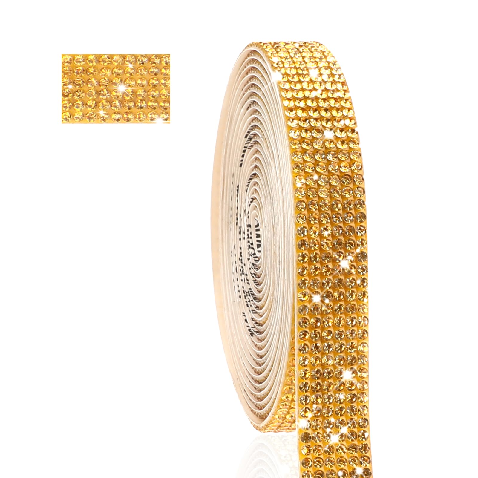 Rollo de cinta autoadhesiva de diamantes de imitación de 3 yardas, cadena de diamantes de cristal de 0.51 pulgadas con ribete dora