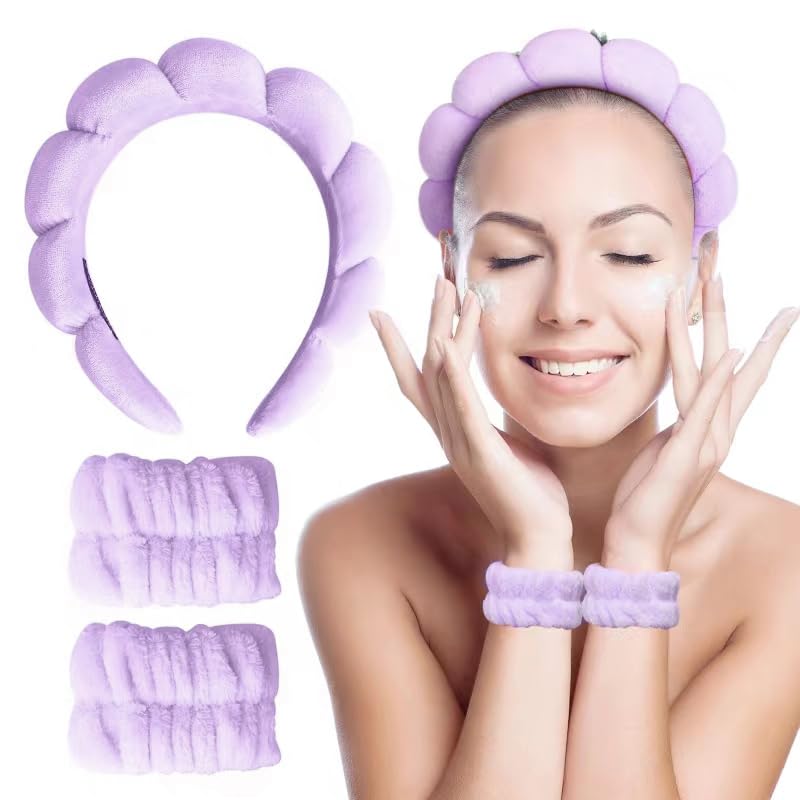 Juego de 3 diademas de spa y pulseras para lavar la cara, diadema de tela de toalla para maquillaje facial para mujeres (morado)