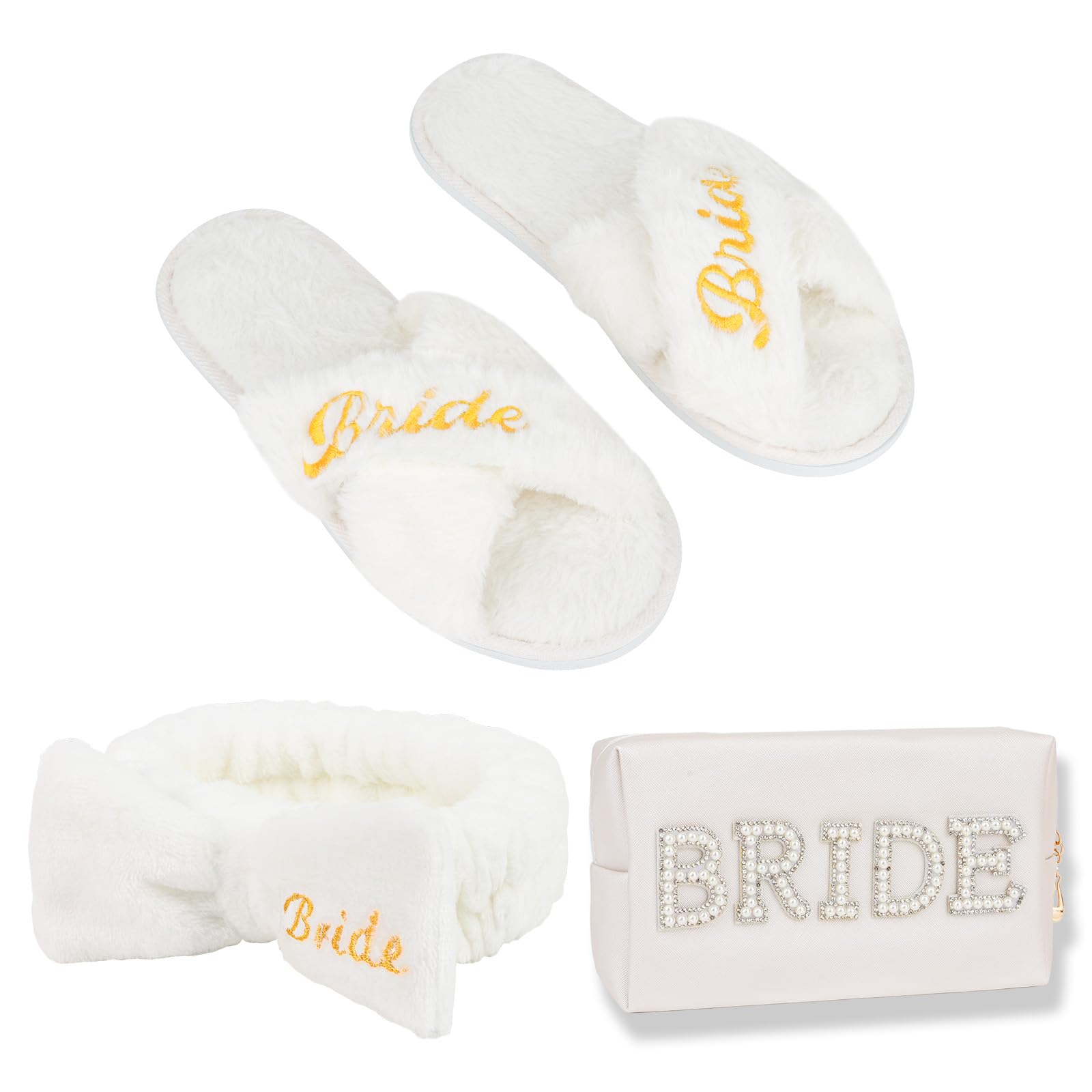 Jaciya Juego de pantuflas de novia y diadema de spa con bolsa de maquillaje, esenciales para el día de la boda para despedida de s