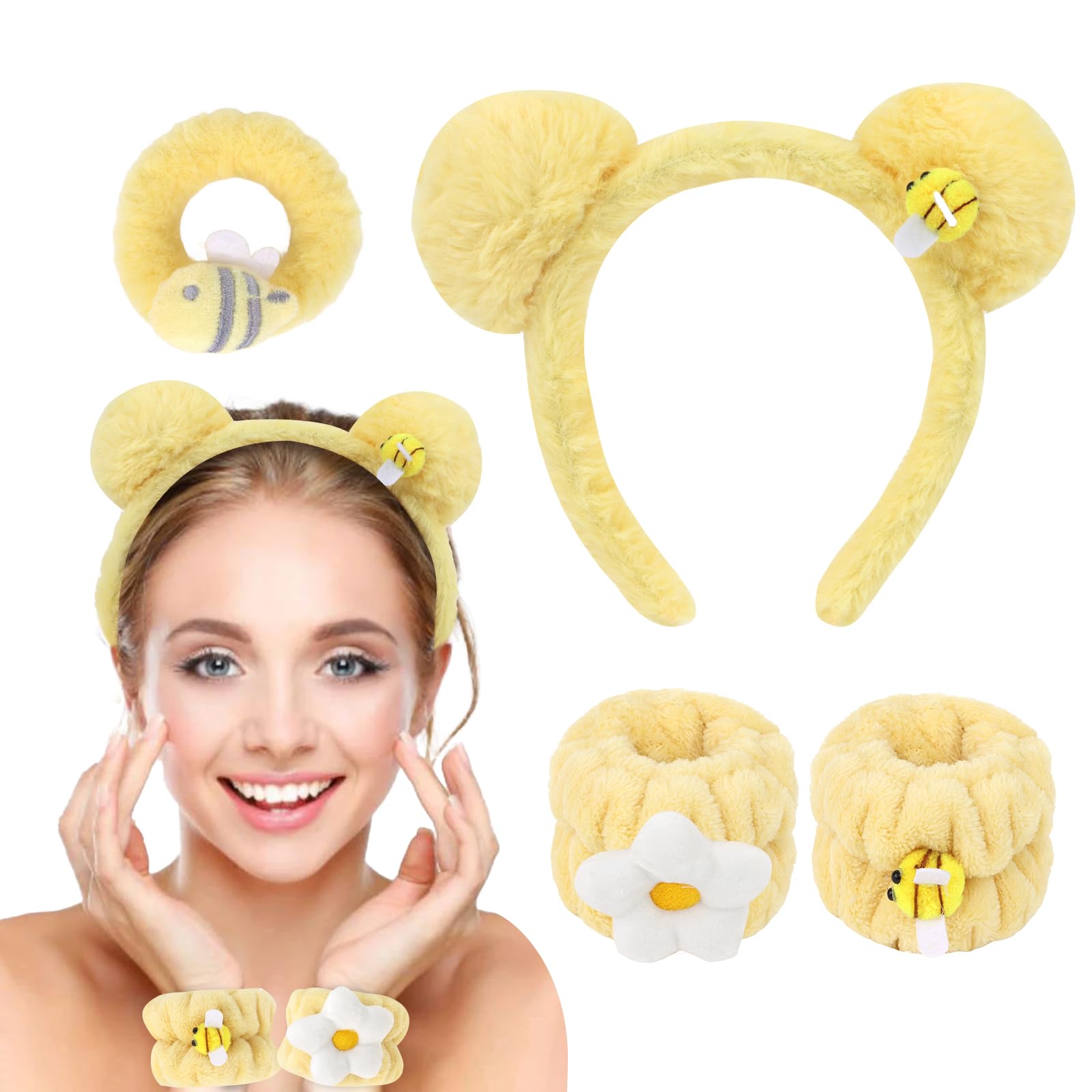 Juego de spa para mujer, juego de diadema y pulsera de orejas de oso de felpa amarillas para lavado de cara y maquillaje