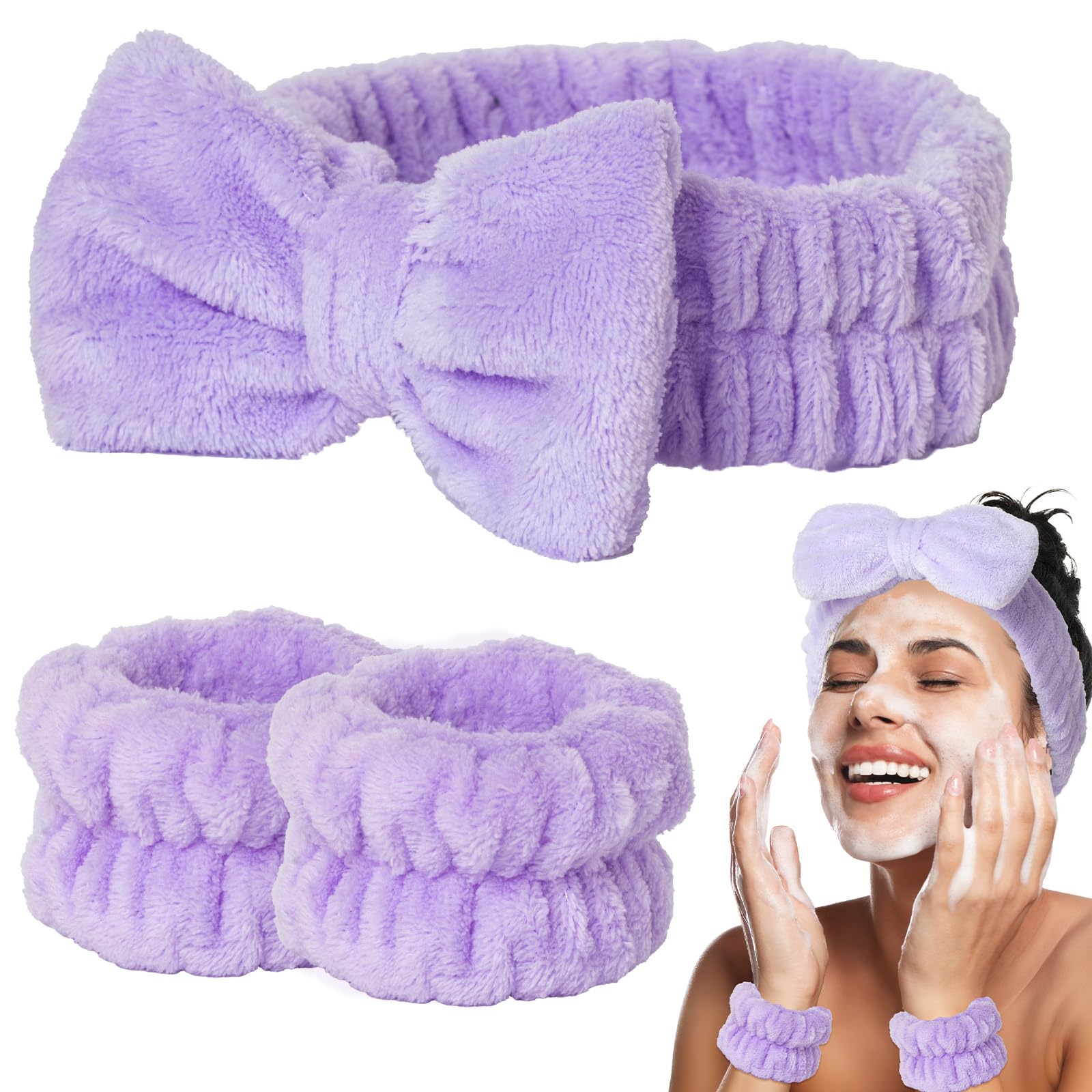Juego de 3 diademas y muñecas moradas para mujeres y niñas, juego de muñequeras para lavado de cara, suaves envolturas faciales pa