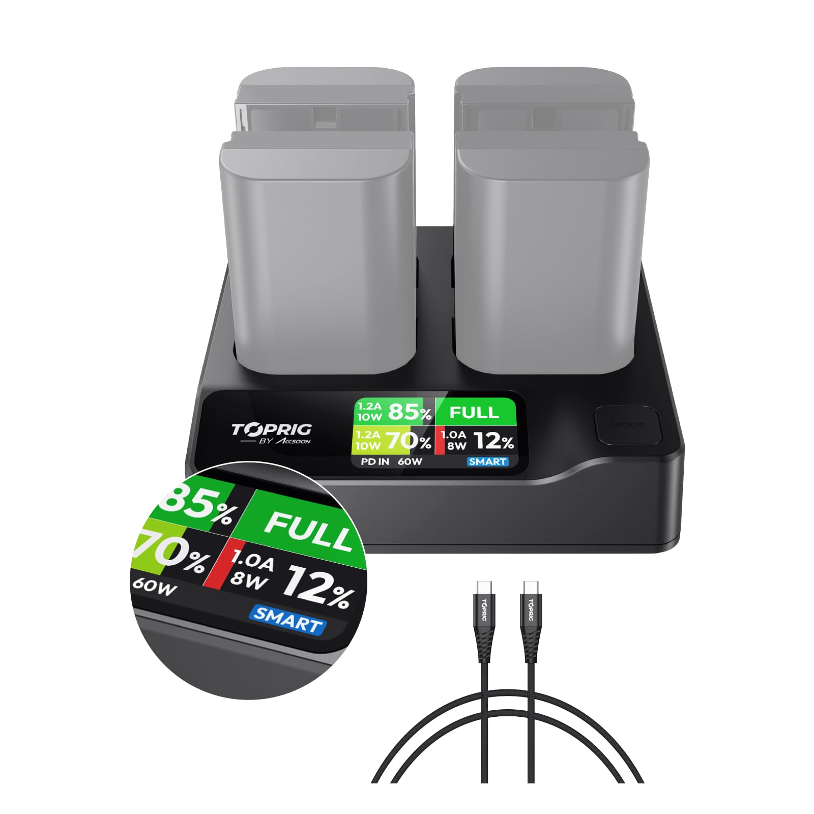 Accsoon toprig LP-E6 – Cargador de batería para cámara de 4 canales, PD60W de carga rápida LP-E6N/LP-E6N/LP-E6NH con pantalla LCD,