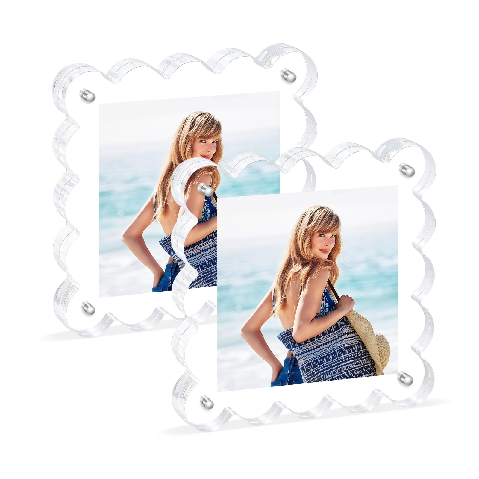 Portarretratos magnéticos acrílicos de 4 x 4, paquete de 2 portarretratos transparentes independientes. Bordes festoneados de dobl