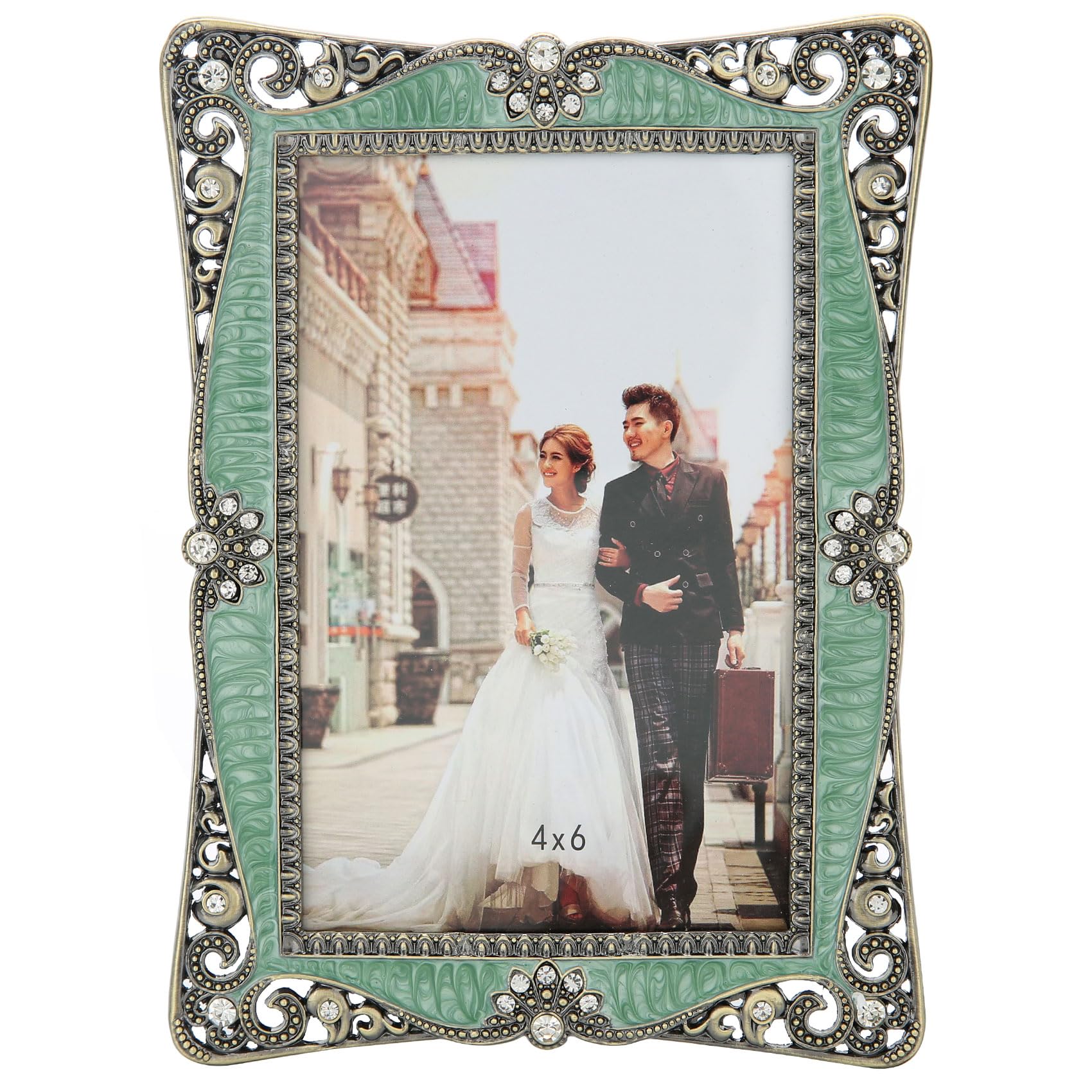 Marco de fotos vintage de 4 x 6 pulgadas con decoración de diamantes de metal verde latón, cubierta frontal de vidrio transparente