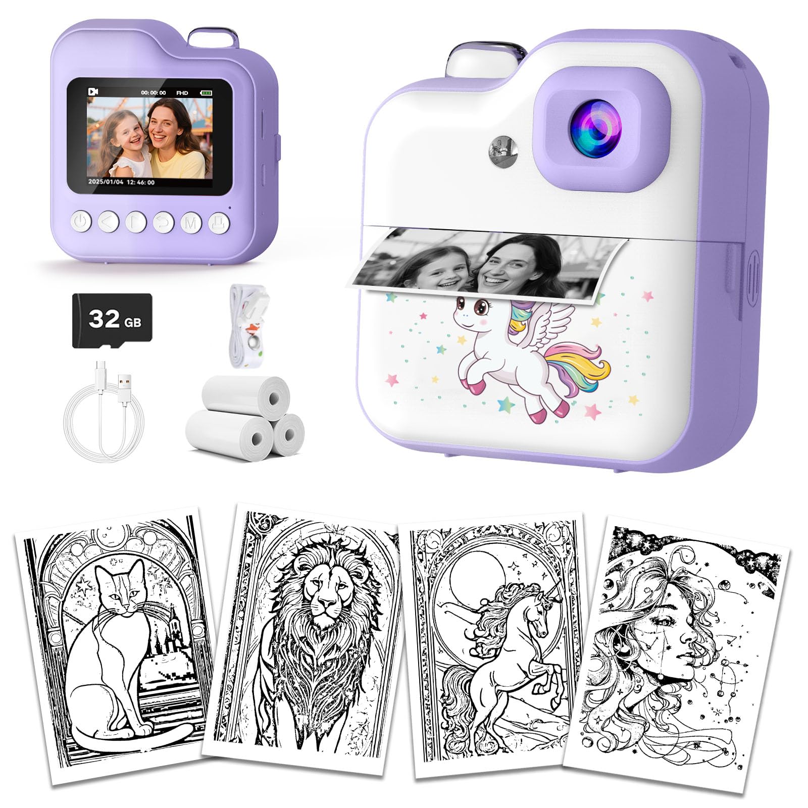 Cámara de impresión instantánea para niños, cámara instantánea de video UHD de 1080P para niños con filtros de anime, juguete port