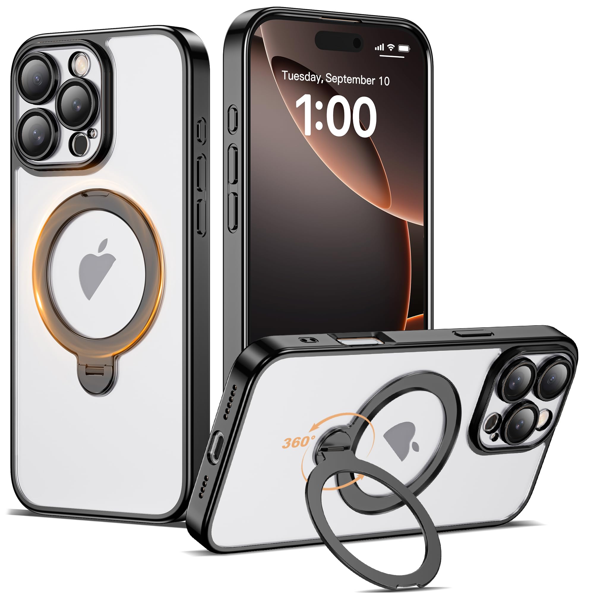 Compatible with iPhone 16 Pro Case with 360° Spin Magnetic Ring Stand [Compatible with Mag-Safe] Full Camera Lens Protector Platin