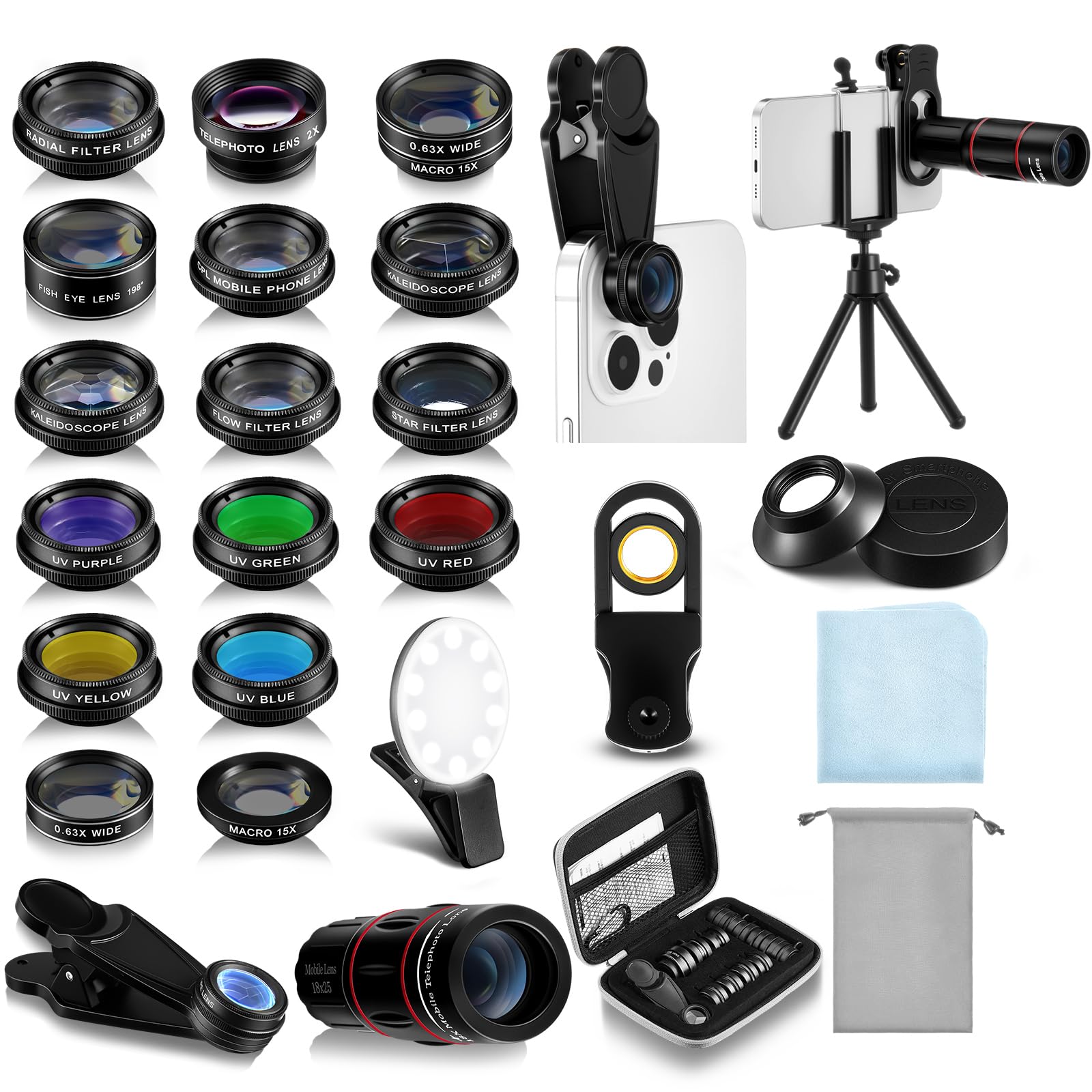 Kit de lente de cámara de teléfono 21 en 1 con luz selfie universal 18x lente teleobjetivo con trípode 0.63x gran angular 15x macr
