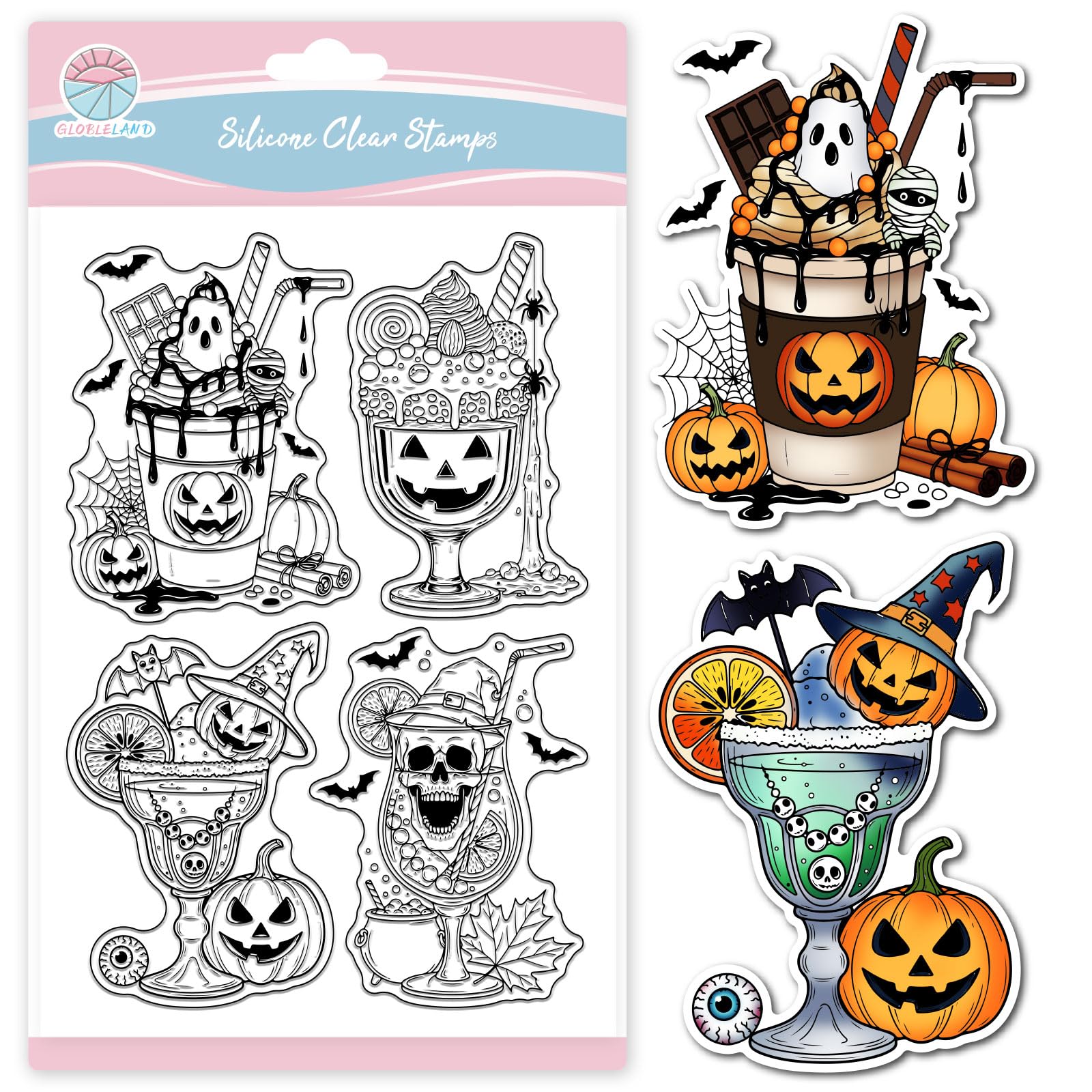 GLOBLELAND Halloween Cup Drink Clear Stamps for Cards Making and Journaling Pumpkins Transparent Stamp Skulls Bats Silicone Stamps
