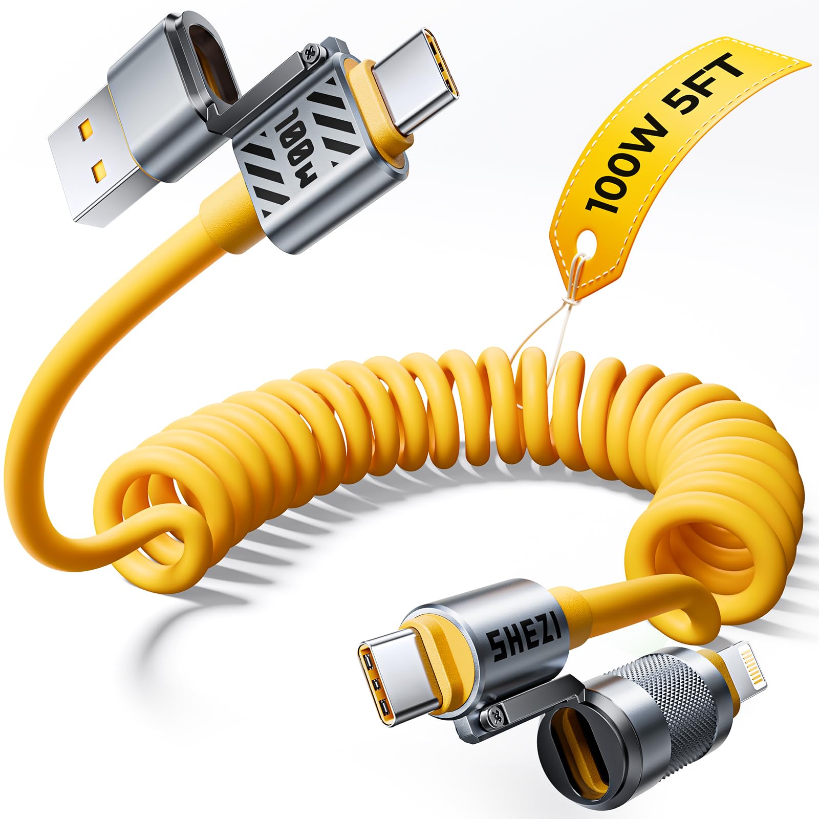 Cable en espiral 4 en 1 USB C de 100 W compatible con cable Lightning de carga rápida y transferencia de datos, compatible con Car