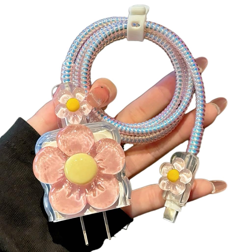 Funda protectora de cable para cargador compatible con iPhone 18 W/20 W, diseño floral de flores rosas, bonito protector de cable