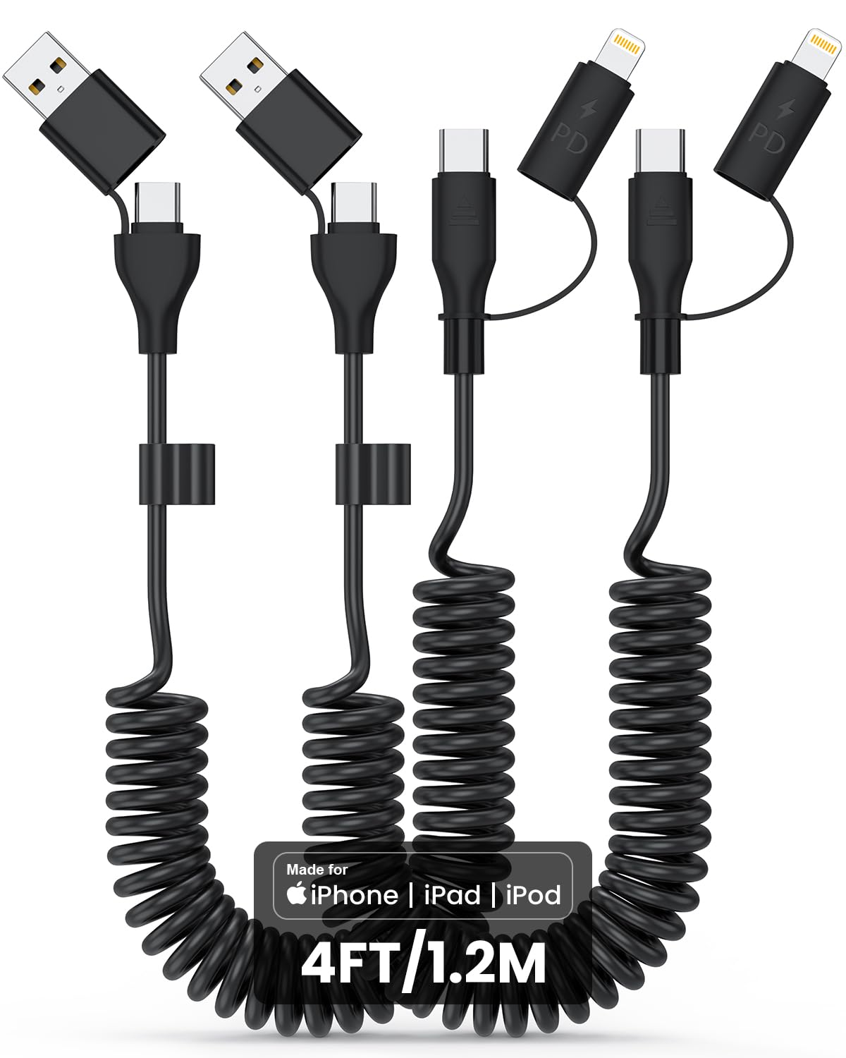 Paquete de 2 cables Lightning en espiral de 60 W, USB-C y Lightning 4 en 1 para iPhone, cable de carga rápida retráctil de 4 pies