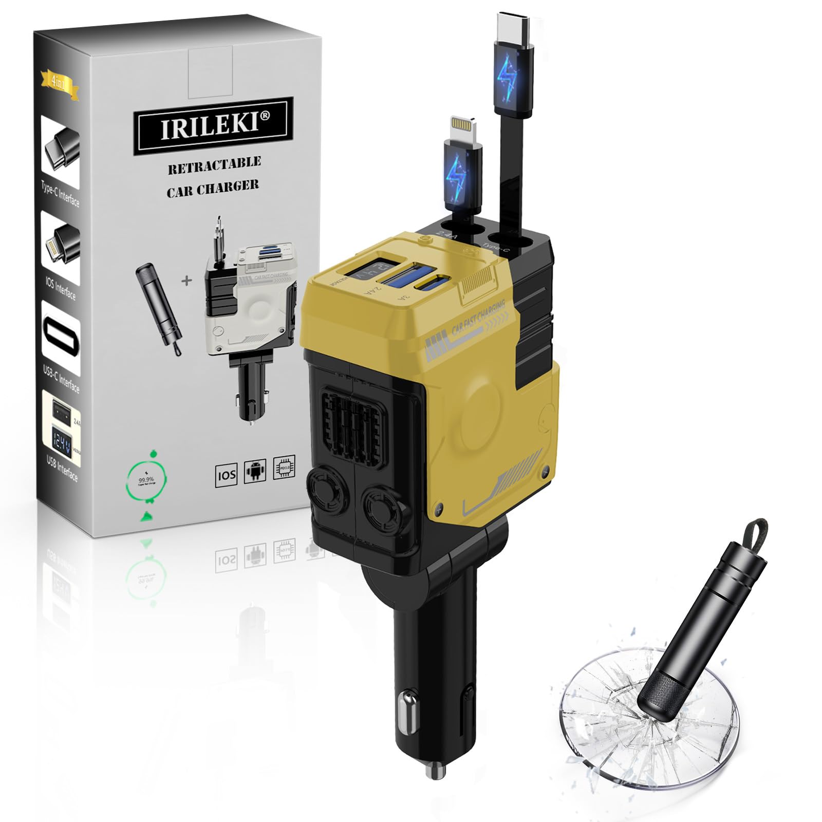 Cargador de coche con interruptor de ventana, retráctil 4 en 1 USB-C/USB-A/Lightning/Tipo C, adaptador de carga rápida compatible