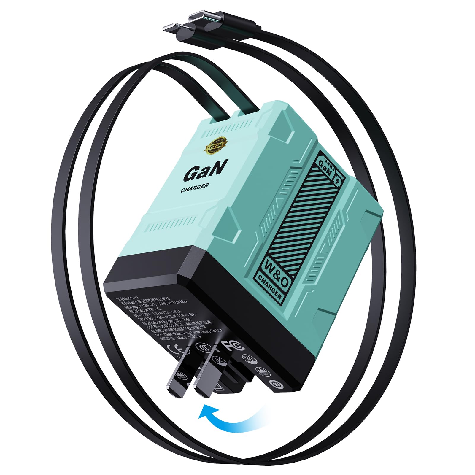 W&O – Cargador GaN de 45 W de carga rápida, cargador retráctil de pared con cables de iluminación y tipo C, para iPhone 16/15/14/1