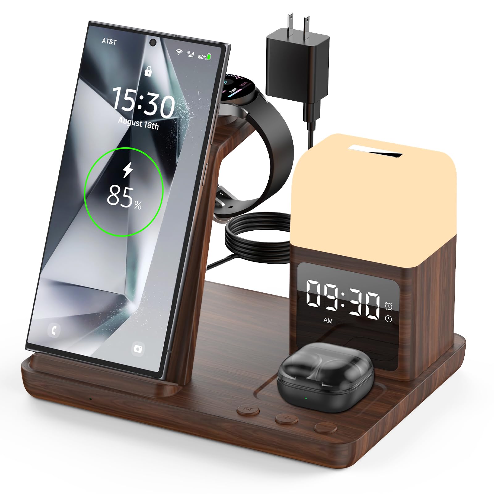 Cargador inalámbrico para estación de carga Samsung/Android, cargador de reloj rápido 6 en 1 con reloj despertador, luz nocturna,