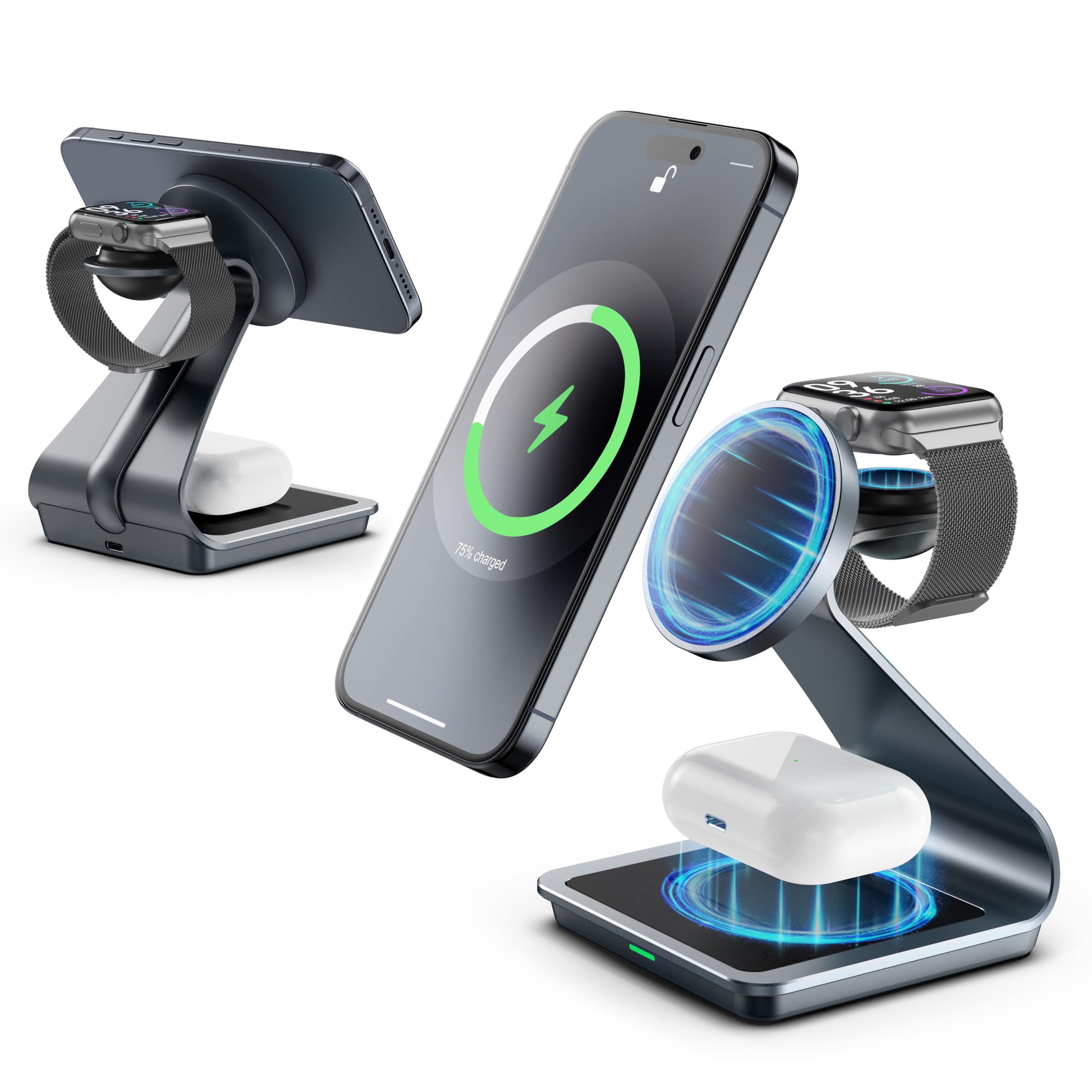 Cargador inalámbrico para iPhone, estación de carga inalámbrica 3 en 1 Apple, MagSafe compatible con iPhone 16/15/14/13/12, Apple