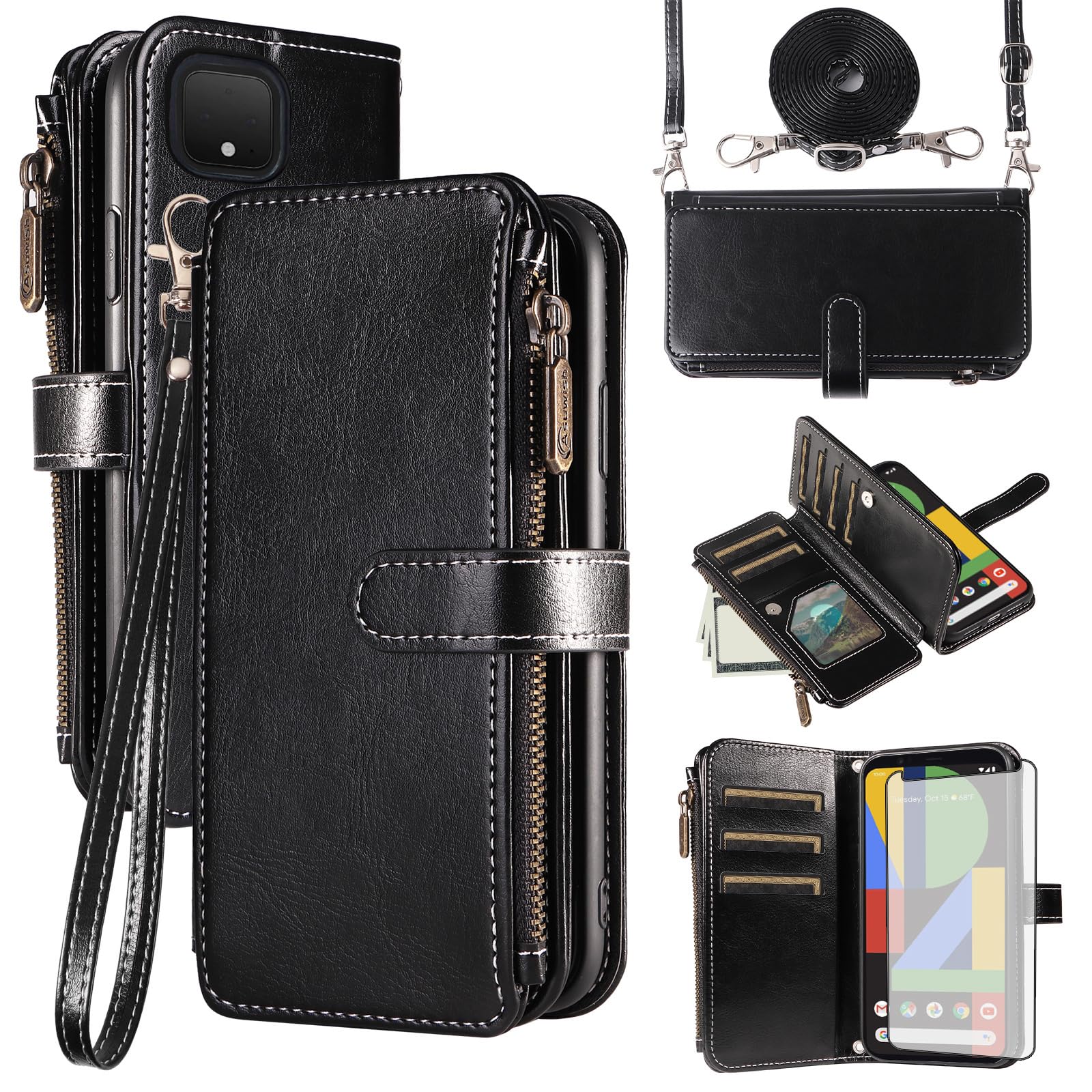 Asuwish Funda de teléfono para Google Pixel 4 con protector de pantalla de vidrio templado y cordón, cartera con cremallera, sopor