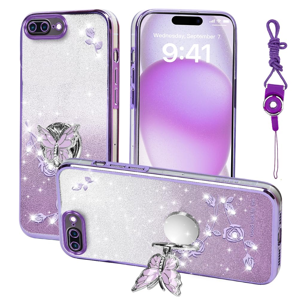 Funda protectora para Apple iPhone 7 Plus, para iPhone 8 Plus, funda protectora de TPU con diseño de mariposas y purpurina con fun