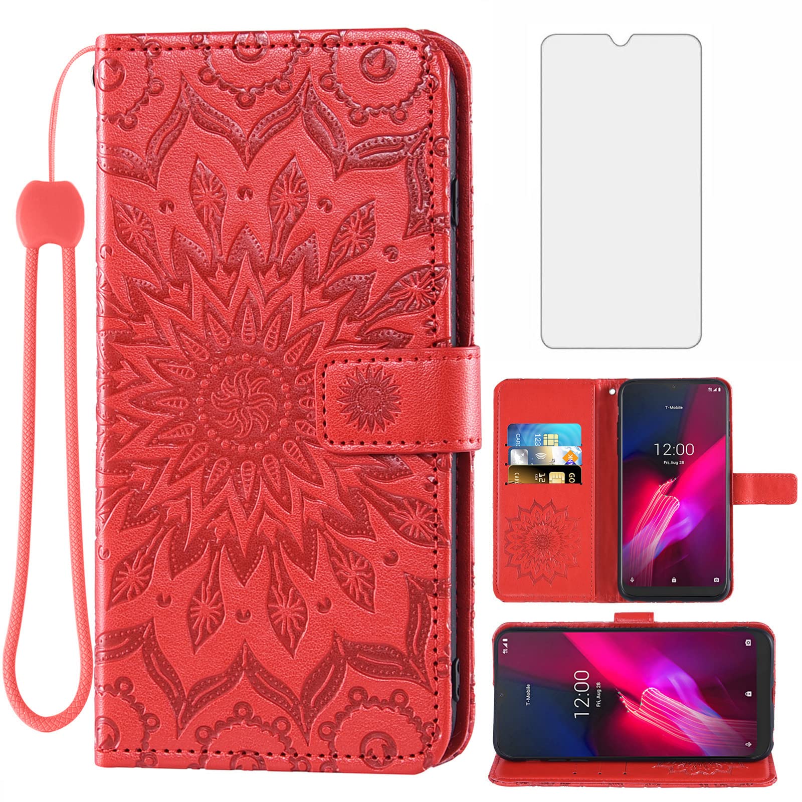 T-Mobile Revvl 4 – Funda tipo cartera con protector de pantalla de vidrio templado y funda delgada de cuero, tarjetero con soporte