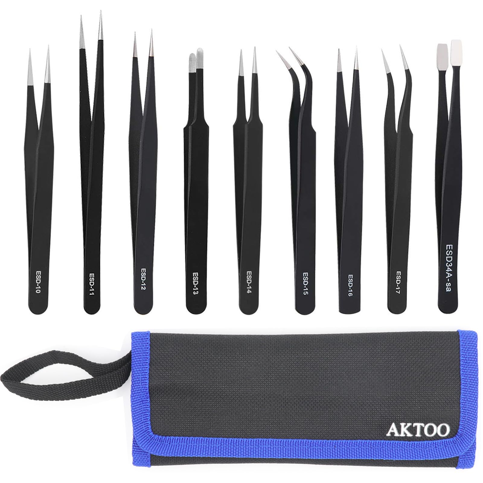 AKTOO Kit de herramientas de pinzas de precisión antiestáticas ESD no magnéticas, juego de pinzas de acero inoxidable con bolsa de
